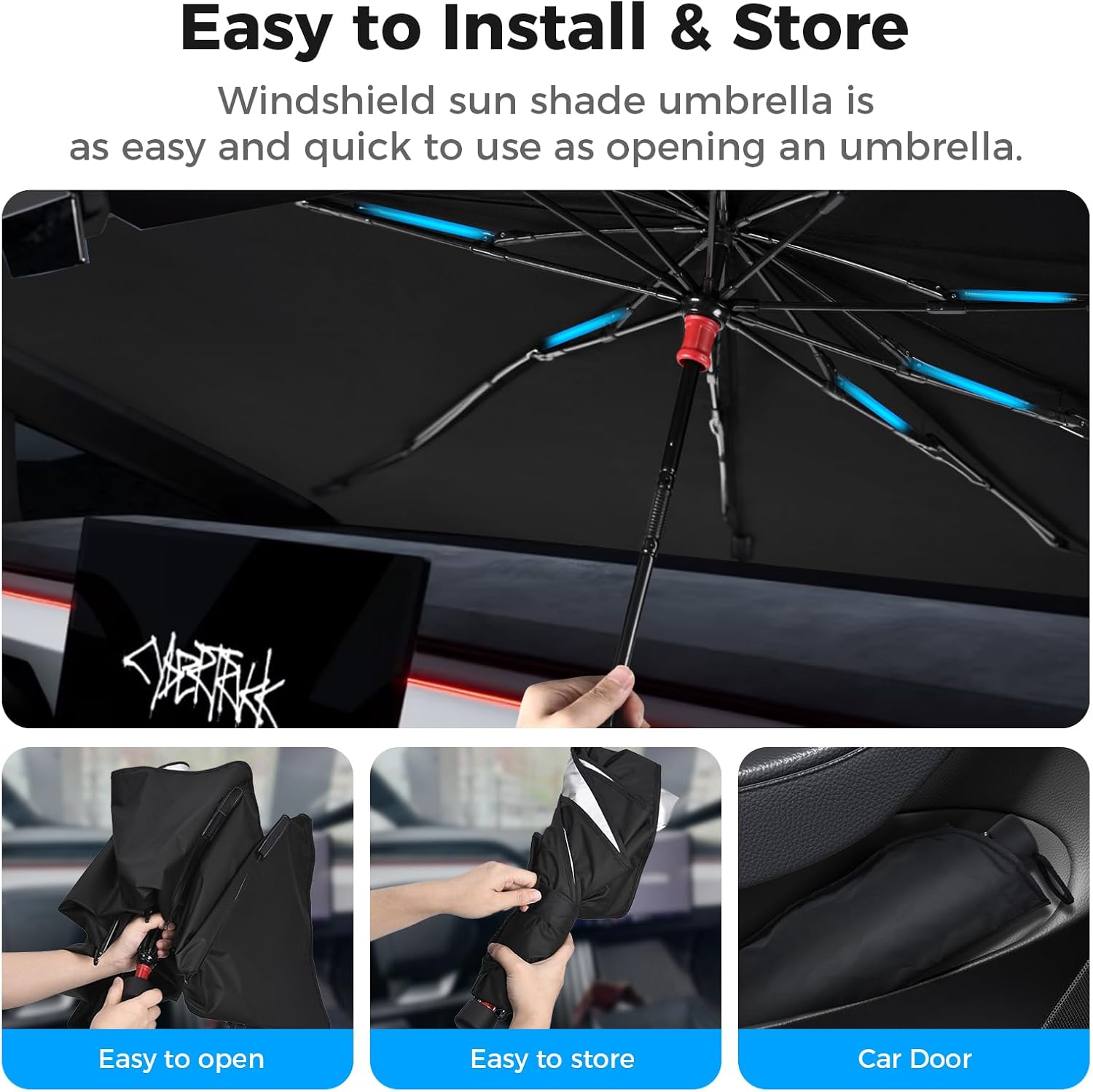 - Easy to Use & Store: Windshields umbrella is similar to an umbrella and is easy to install and store. Specially designed for 2024 2025 Cybertruck, it can be folded in seconds and seamlessly installed in our storage bag, making it easy to store under the car seat or in the door pocket.