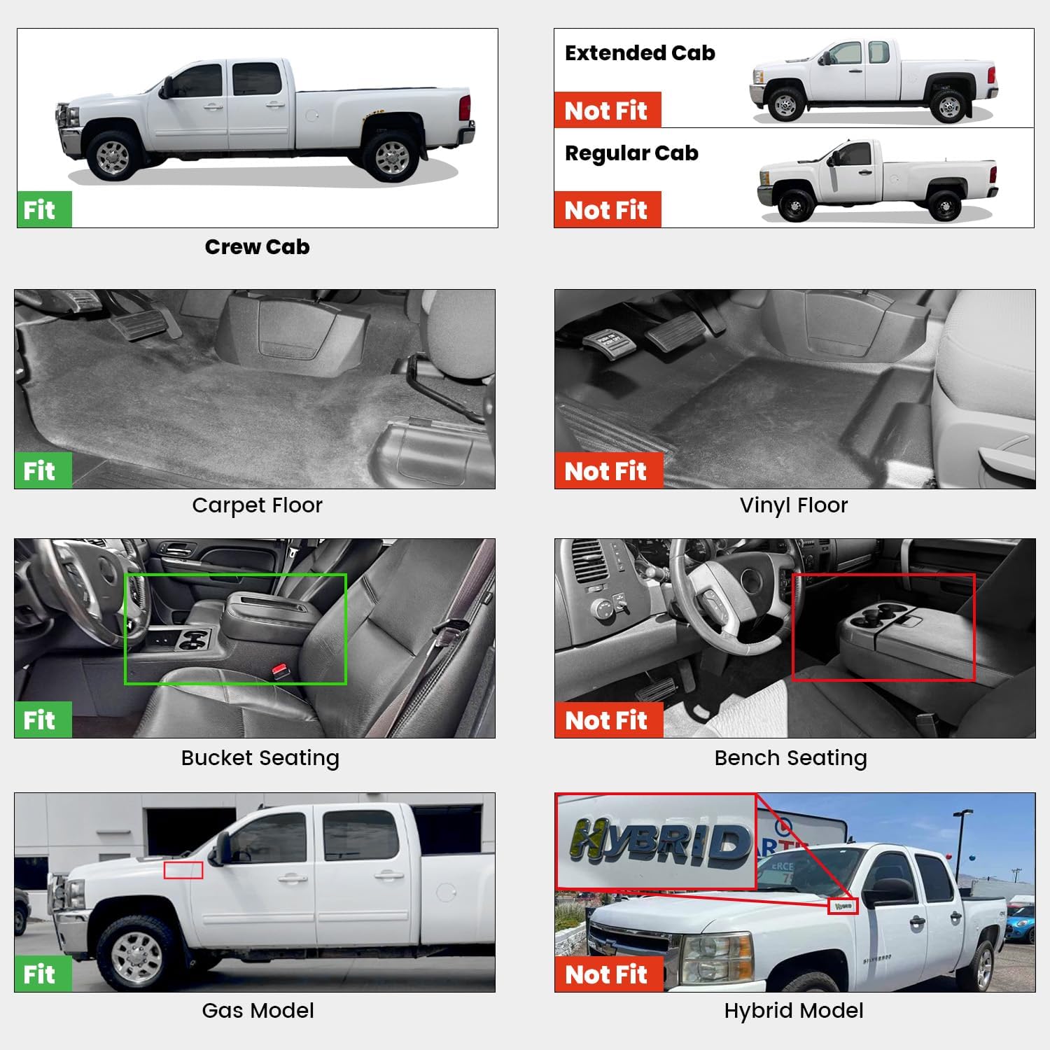 - 【Custom Fit】LASFIT floor mats perfectly fit for Chevrolet Chevy Silverado/GMC Sierra 1500 2007-2013 (Fit Gasoline, Not Fit Hybrid) Only Crew Cab (Not Fit Regular Cab/Double Cab), for Chevrolet Silverado/GMC Sierra 2500HD 3500HD 2008 - 2014 Crew Cab, Only Bucket Seat, with Carpet Floor (Not Fit Vinyl Floor).