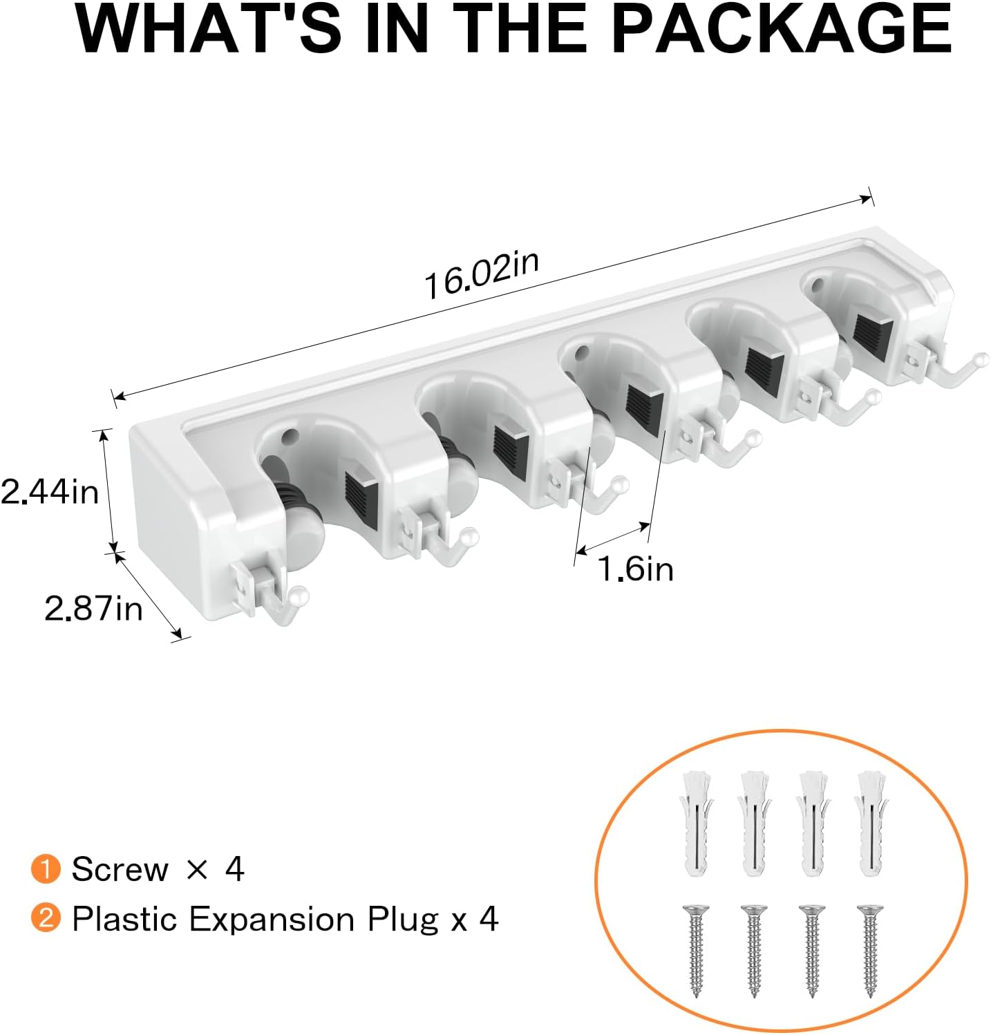- CLEANING TOOLS STORAGE RACK: This wall mounted broom rack is suitable for storing cleaning supplies, gardening tools, kitchen utensils and hardware tools. Our broom rack is the best companion for your kitchen, garage, laundry room, keeping your work area clean and tidy