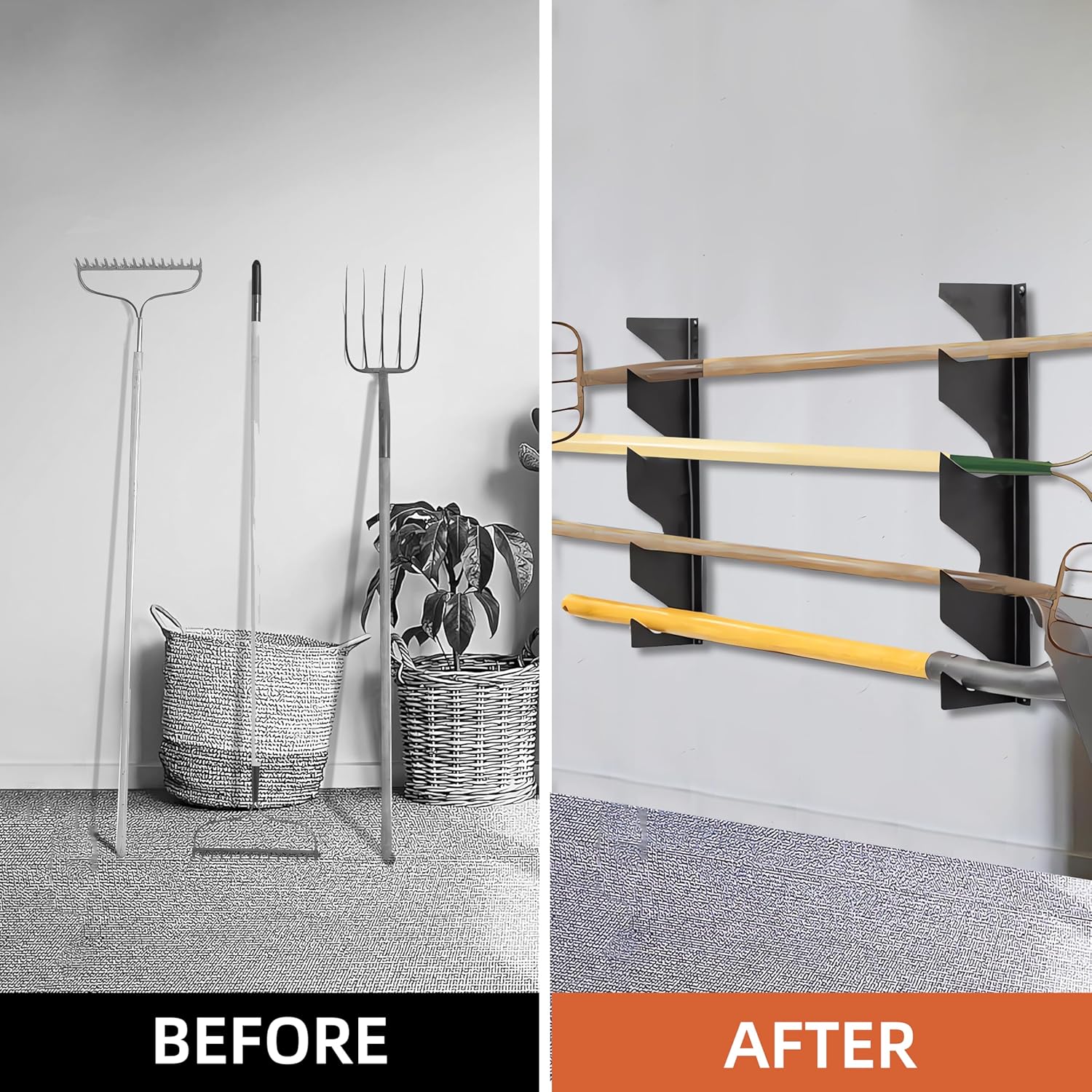 - Wall-Mounted Garage Tool Organizer-Reclaim floor space with 17.5"x4" horizontal wall design—secures shovels, rakes & brooms vertically. Ideal for garages/sheds with exposed studs, keeps long-handled tools accessible yet tangle-free