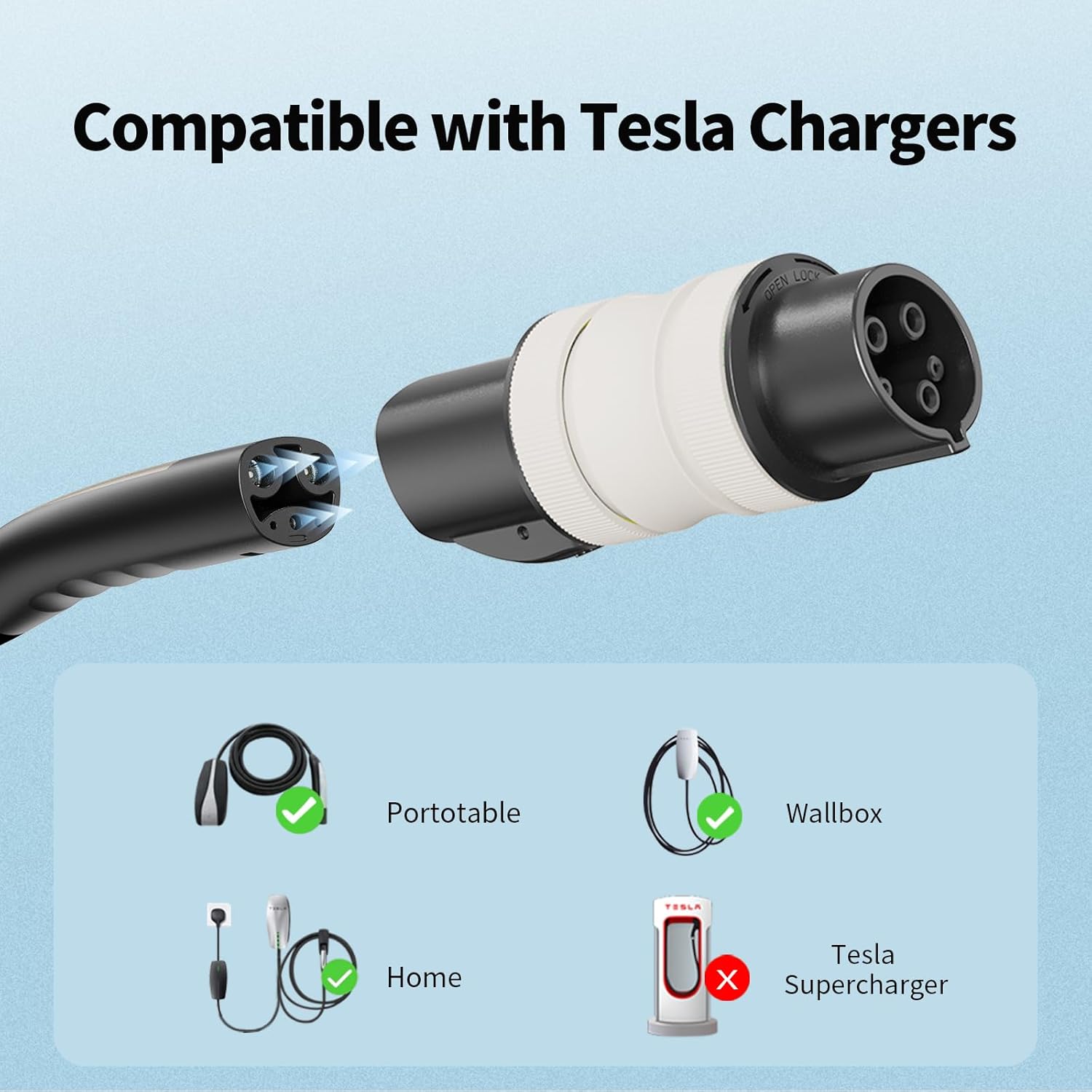 - 【Small and Portable】Adopts a double rotation locking structure to ensure zero shaking connection of the charging port. Its intelligent compatible design perfectly adapts to Tesla/NACS charging piles, cincluding wall chargers, destination chargers and mobile chargers, realizing seamless connection between.