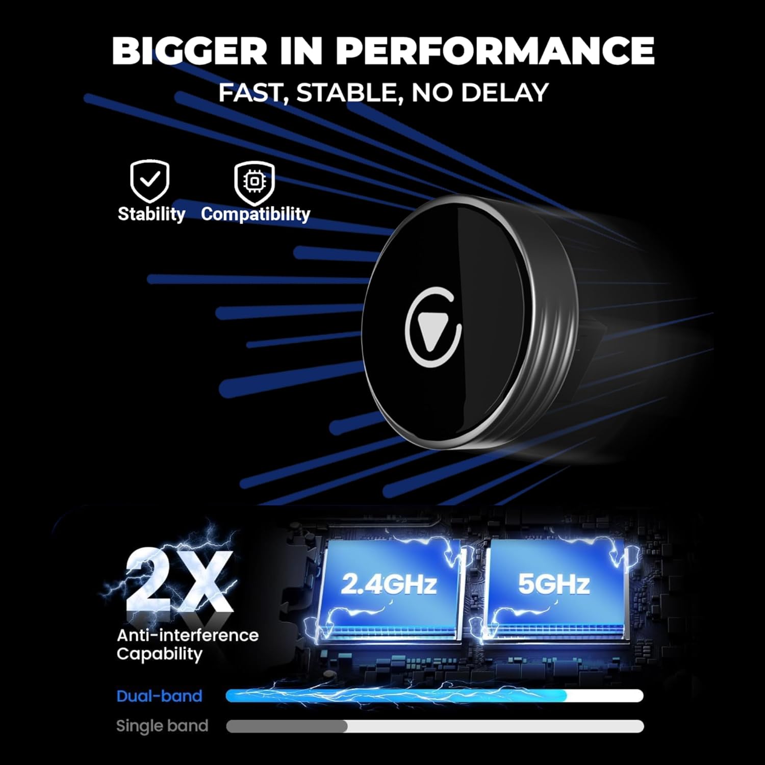 - 🚀 Dual-Band Super Performance – Featuring a 2.4GHz + 5GHz dual-band chipset and upgraded 8-core processor for 100% improved performance, our adapter ensures enhanced stability and near-zero latency. Experience lightning-fast, smooth Wireless CarPlay performance for seamless music streaming, navigation, voice assistance and hands-free calls.