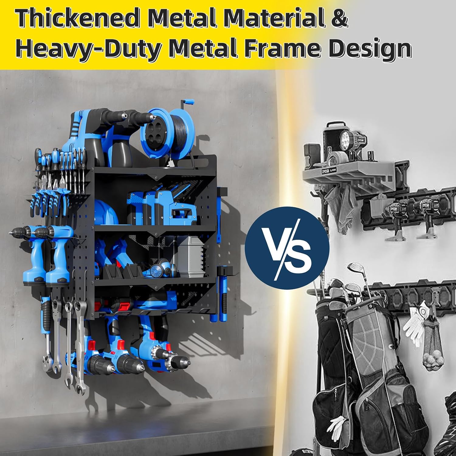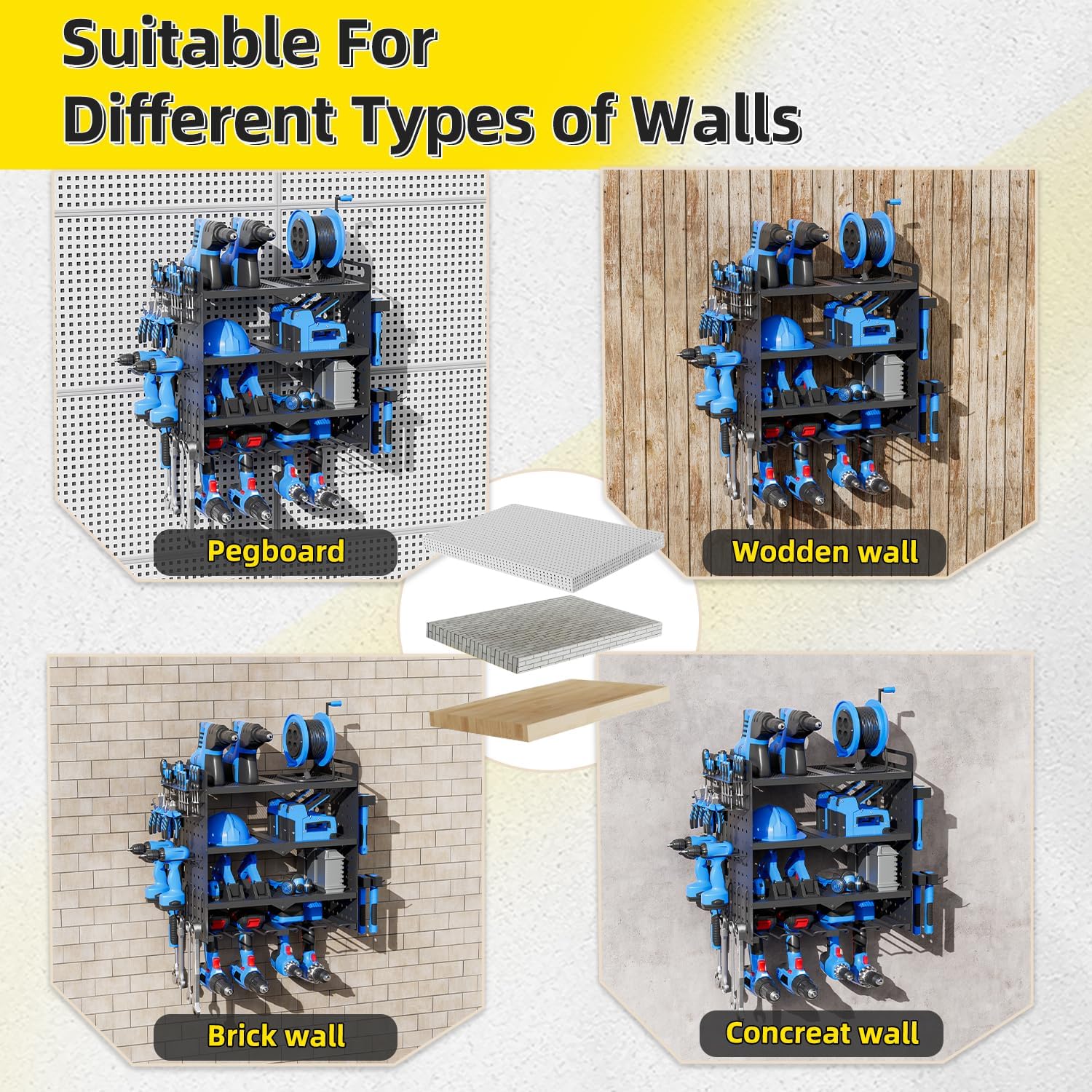 - 💪420-600 LB Load Capacity & Heavy-Duty Construction : Engineered from industrial-grade steel, our large power tool organizer wall mount boasts an exceptional 420-600 lb load capacity. Confidently store heavy power tool storage of any weight. Rigorous testing ensures stability – no more worries about breakage or falls.