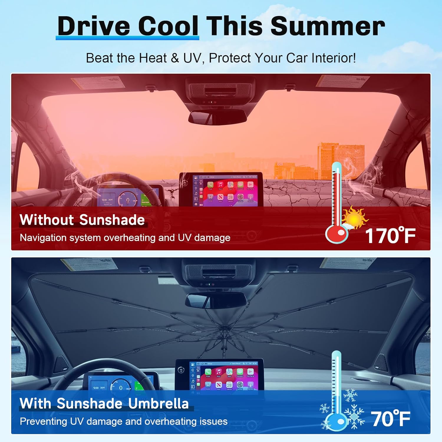 - 1. Sun & Heat Insulation: Windshield Umbrella Sunshade for 2024 2025 Honda Prologue Accessories, 99.9% UV protection, upgraded wrinkle-resistant fabric reflects heat, keeps car cool. Protects interior from fading & cracking, ensuring comfort on hottest days