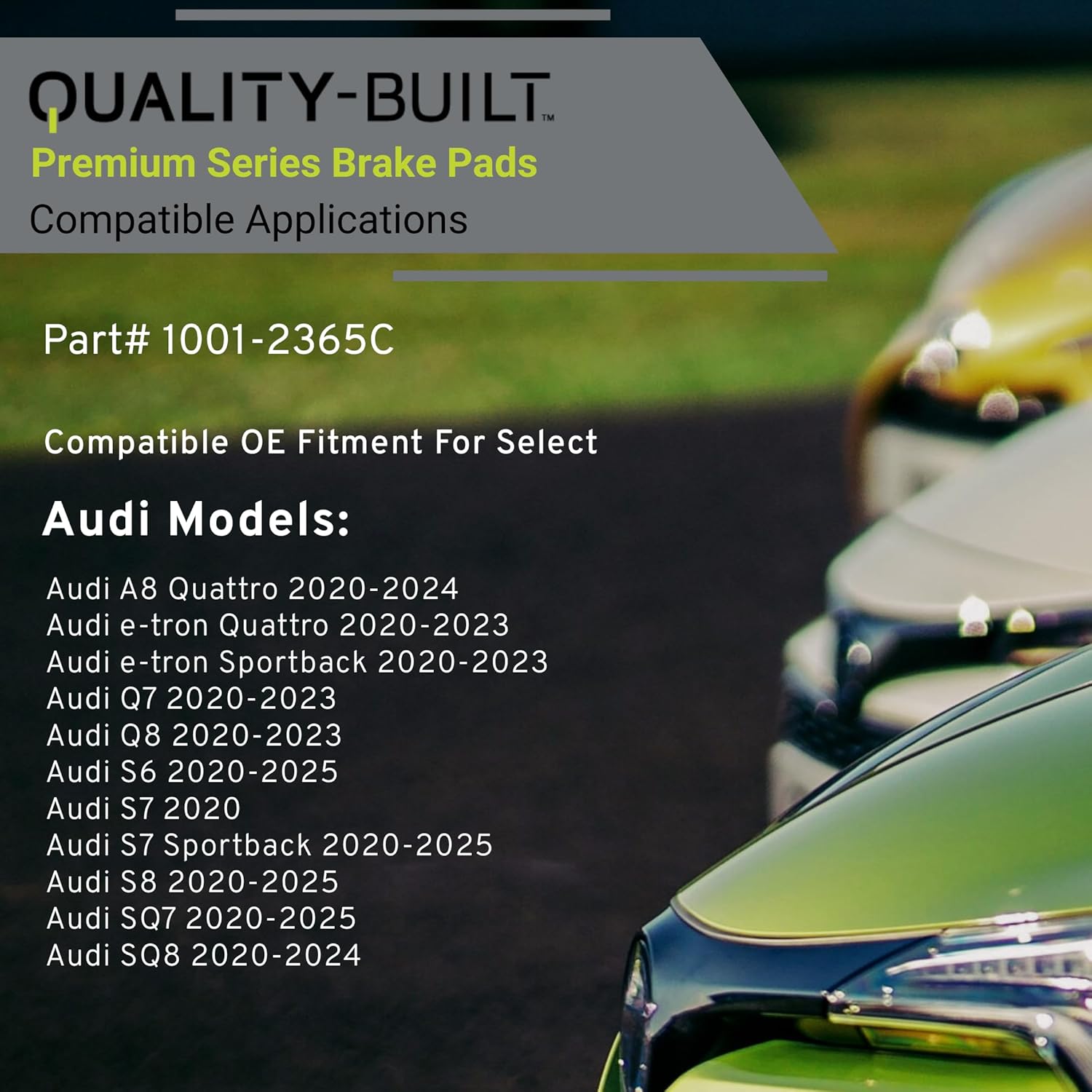 - VEHICLE FITMENT LIST: Audi A8 Quattro 2024-2020, e-tron Quattro 2023-2020, e-tron Sportback 2023-2020, Q7 2023-2020, Q8 2023-2020, S6 2025-2020, S7 2020, S7 Sportback 2025-2020, S8 2025-2020, SQ7 2025-2020, SQ8 2024-2020 (PART#1001-2365C)