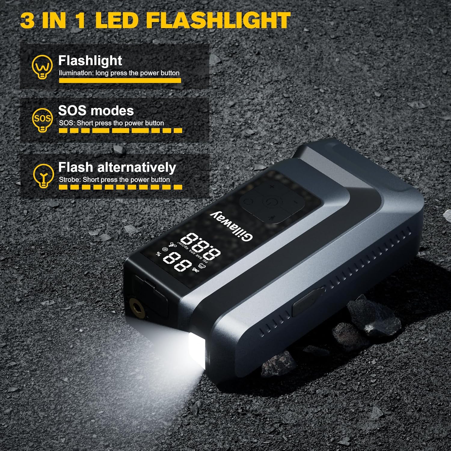 - 【7-IN-1 ALL-ROUND JUMP STARTER】The car battery jump starter highlights 7 integrated premium functions transcending general jump starters. It's a car jumper starter portable, portable air compressor, pressure gauge, portable power bank, and 3-mode lights (flashlight, strobe, SOS) . Portable, versatile and must-have road trip car Accessoriesfor outdoors or emergencies.