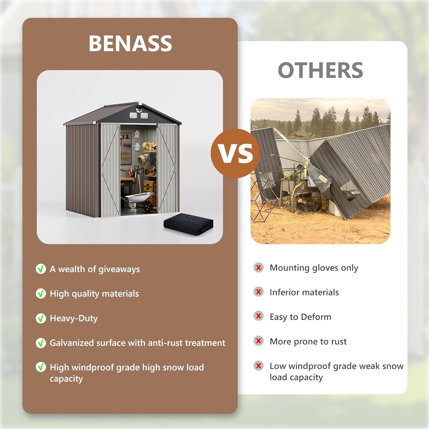 - 【Outdoor Storage Shed】Our tool shed is made of thickened galvanised steel not only strong and durable but also provides excellent protection against rust; with the reinforced frame, it can easily cope with all kinds of harsh weather and has a long service life. Note: Maximum Wind Rating: 6 (24-30mph); Maximum Allowable Snow Thickness: 6 inches.