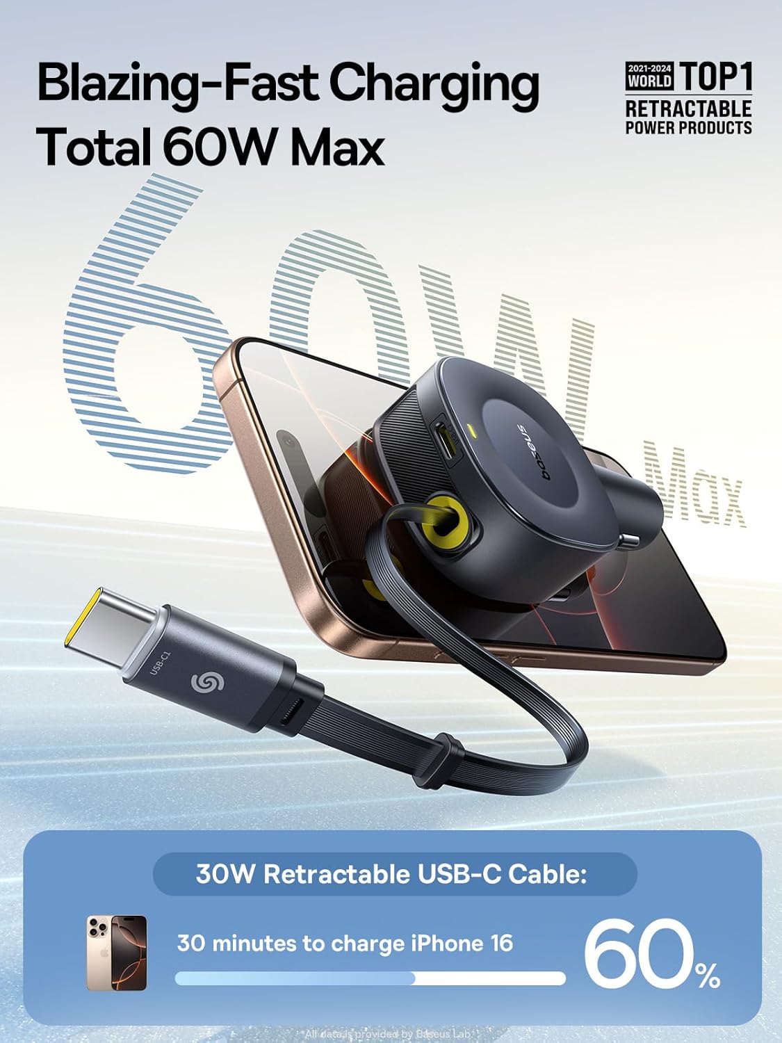 - 60W Max Fast Charging Car Charger: Power up smartphones and tablets in a flash with 30W max output from this retractable USB-C car charger. It includes a 30W USB-C cable output and a 30W USB-C port output, effortlessly ensuring your road trips and daily commutes hassle-free