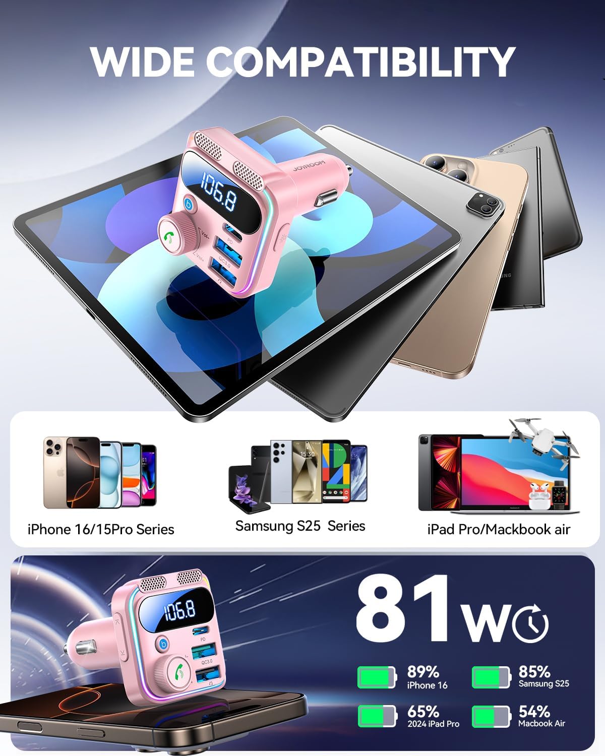 - Safer & Widely Used: JOYROOM bluetooth 5.4 fm transmitter is equipped with multiple protections such as over-current, over-voltage, over-heat and short-circuit, ensuring safe charging while driving! The frequency range is between 88.1MHz-107.9MHz. After booting, it will automatically connect to the saved Bluetooth device. Compatible with 12V-24V cigarette lighter sockets and 99% of all smartphones
