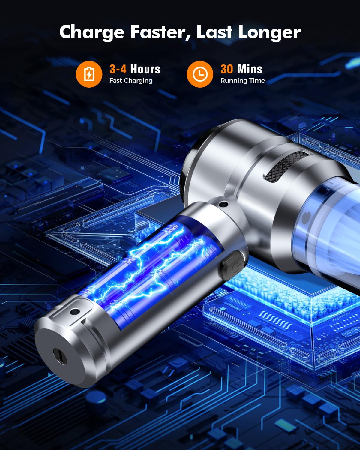 - 【24000PA Powerful Suction】This car vacuum portable cordless is equipped with an upgraded powerful high-speed brushless motor, which can reach 110,000RPM in a minute. With 3 adjustable suction modes of 8000PA, 16,000PA and 24,000PA.It can effortlessly deal with all kinds of dust and debris in your car or home.