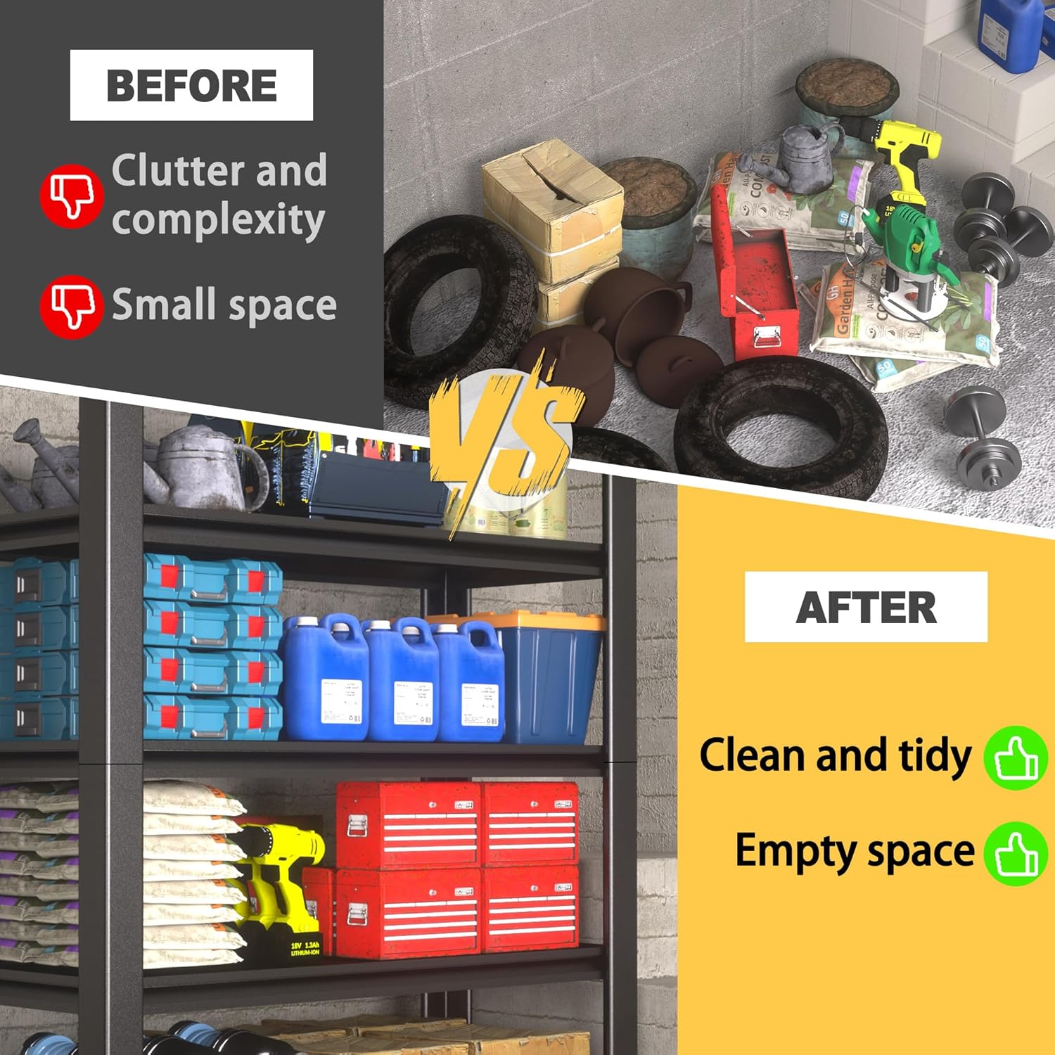 - Durable Metal Construction: Constructed from high-quality, rust-resistant metal with a powder-coated finish, this garage shelving unit is built for long-term use and maximum durability.
