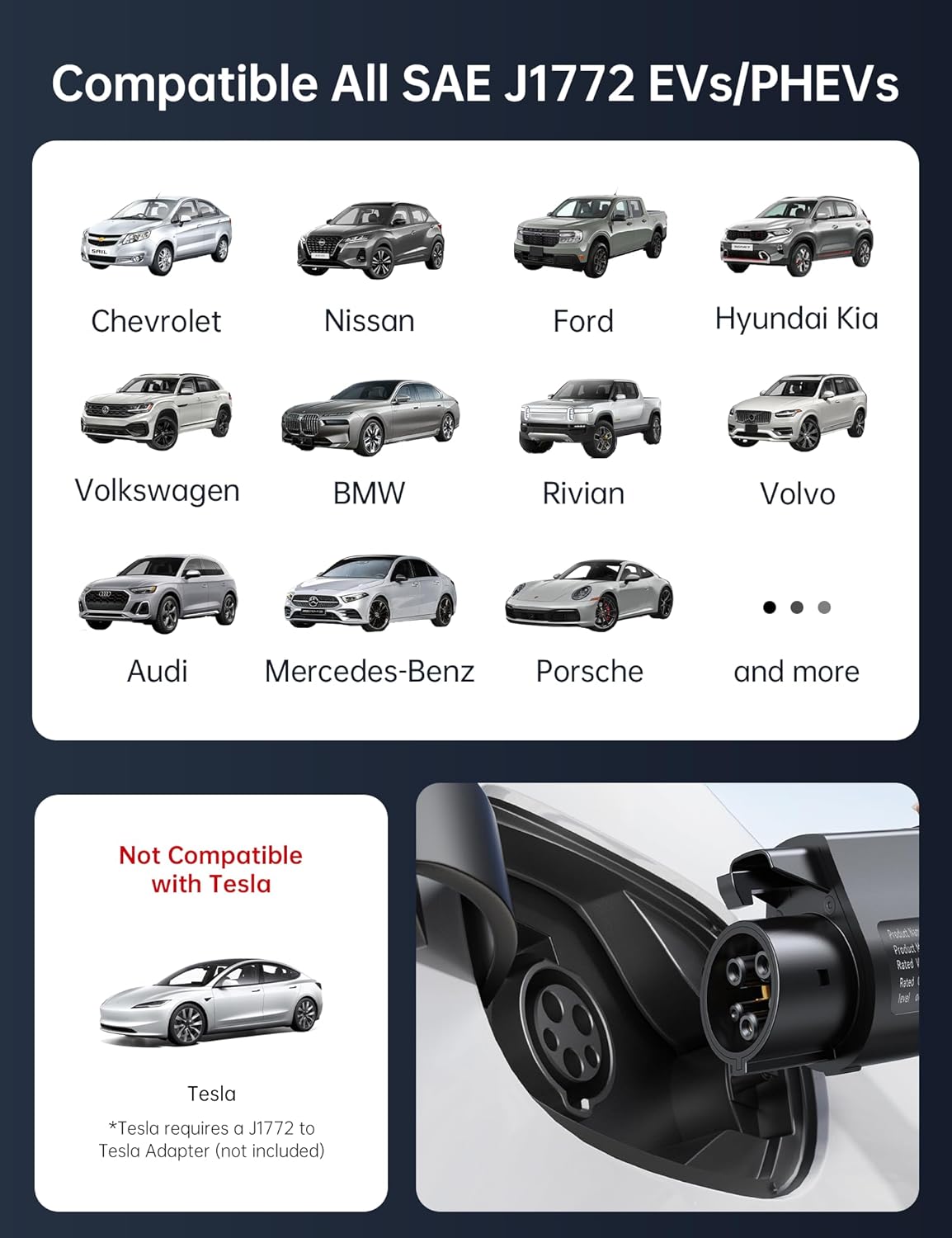 - [Universal Compatibility] With our ev charger level 2, you can power up multiple vehicles, whether it's your car, your friends', or your family members'. Compatible with all electric vehicles and plug-in hybrids using the SAE J1772 connector, including GM, Nissan, Audi, Kia, Honda, BMW, Hyundai, and more. For Tesla vehicles, just use a J1772 to Tesla adapter (sold separately). Perfect for home, travel, or when hosting guests, ensuring everyone's EV is always ready to go!