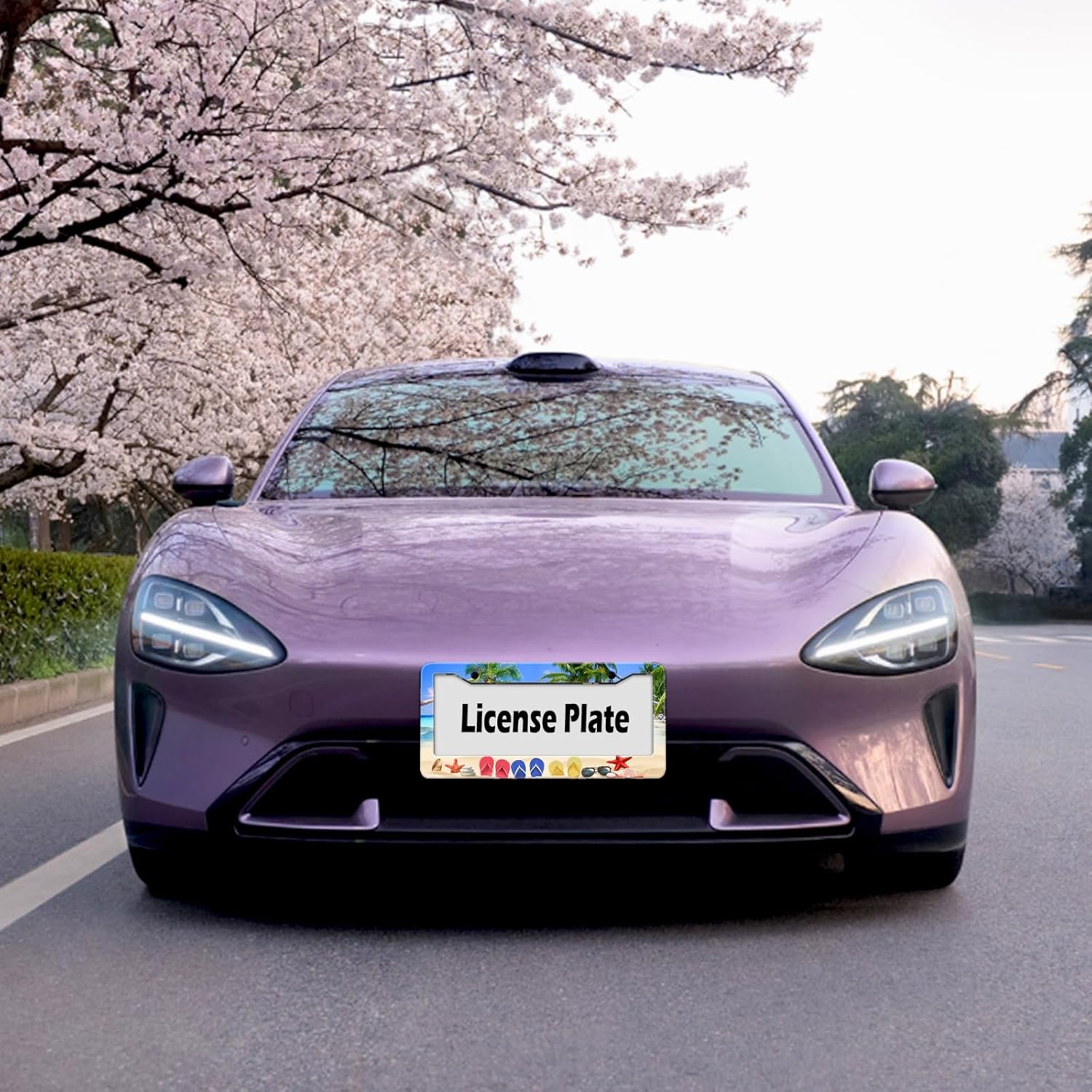 Beach Flip Flops License Plate Frame, Ocean Beach Vacation Scene License Plate Hloder Covers, Metal Aluminum Rustproof Car Accessories for Women Men 2 Holes with Screw Caps