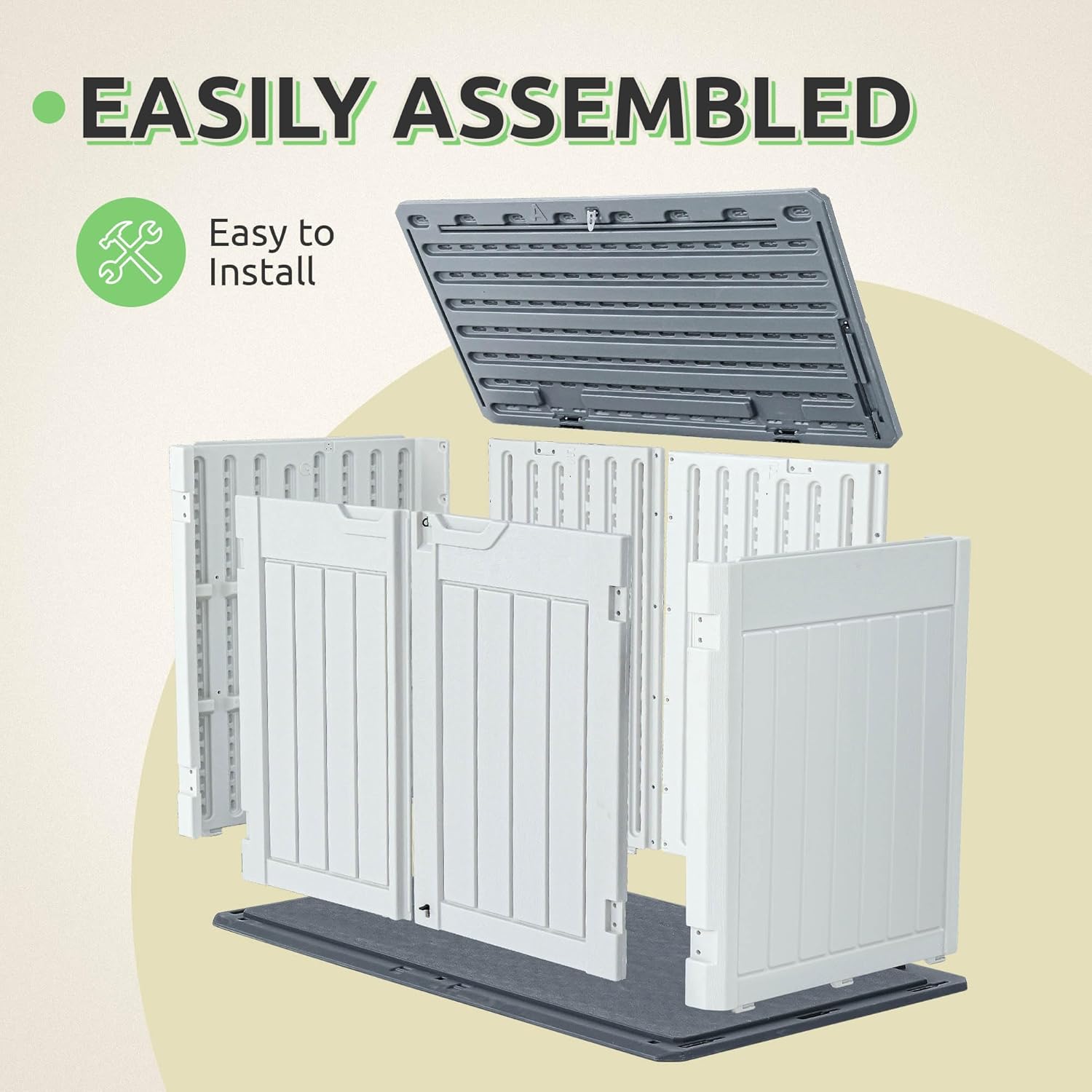 - Quick Setup and Separate Shipment: Measuring 53.2''L x 33.2''W x 46.3''H exterior, and 50.8''L x 29.9''W x 44.5''H interior, this resin plastic shed comes with clear instructions for a 20-minute easy assembly.