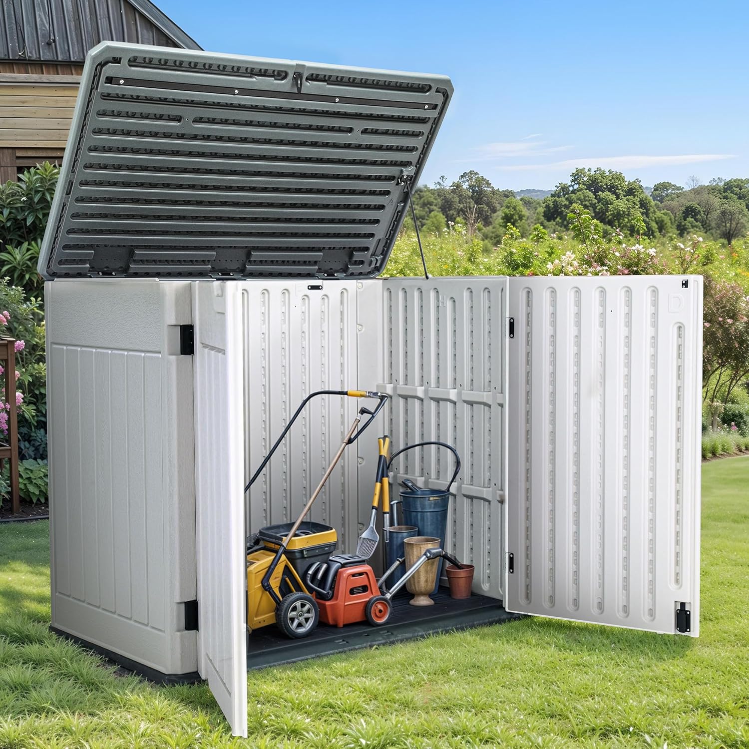 - Flexible and Secure Access: This horizontal shed boasts multi-directional opening and a flip-cover support rod for easy access, complete with a padlock latch (lock not included) and step-on lock to secure the door, making it a versatile storage solution
