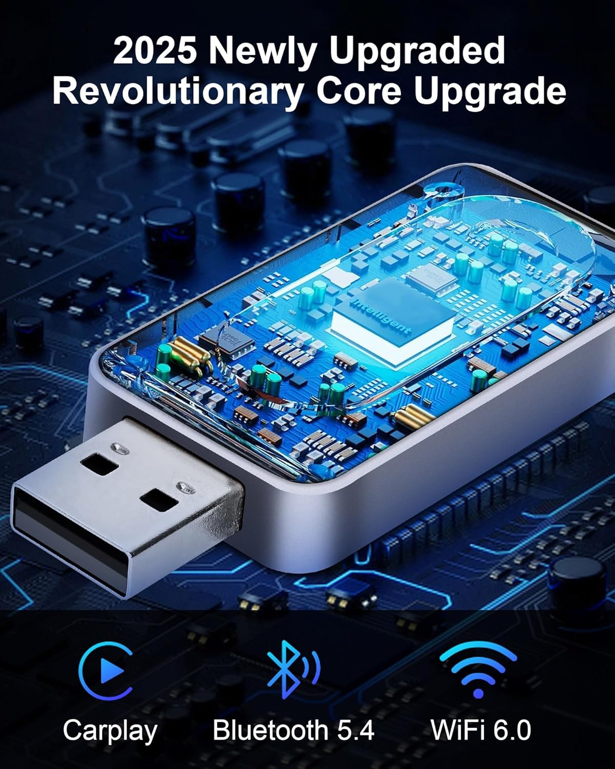 - 【Bluetooth 5.4 & Wi-Fi 6】The 2025 upgraded wireless CarPlay adapter delivers faster connections, significantly reduced latency, and enhanced stability. Equipped with intelligent anti-interference technology, it provides smoother music switching, quicker voice response, and more stable navigation—drastically minimizing lag and disconnections.