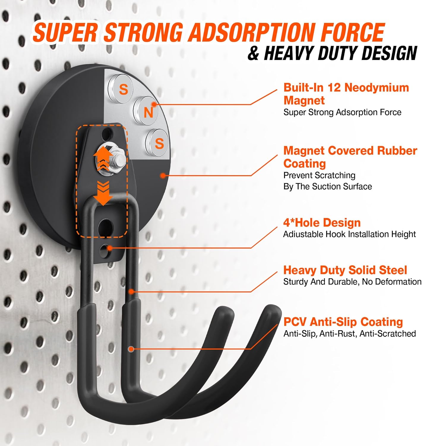 - 🧲[High Quality] The garage hooks with magnets are made of heavy duty steel metal material (we are increased the length of the hook), have strong load bearing capacity. Solid steel body adopts anti-rust coating and non-slip PVC sheath which gives better grab on hanging items and prevent them from falling or being scratched. The tubular double hooks design makes the heavy duty magnetic utility hooks more stable than regular single hooks