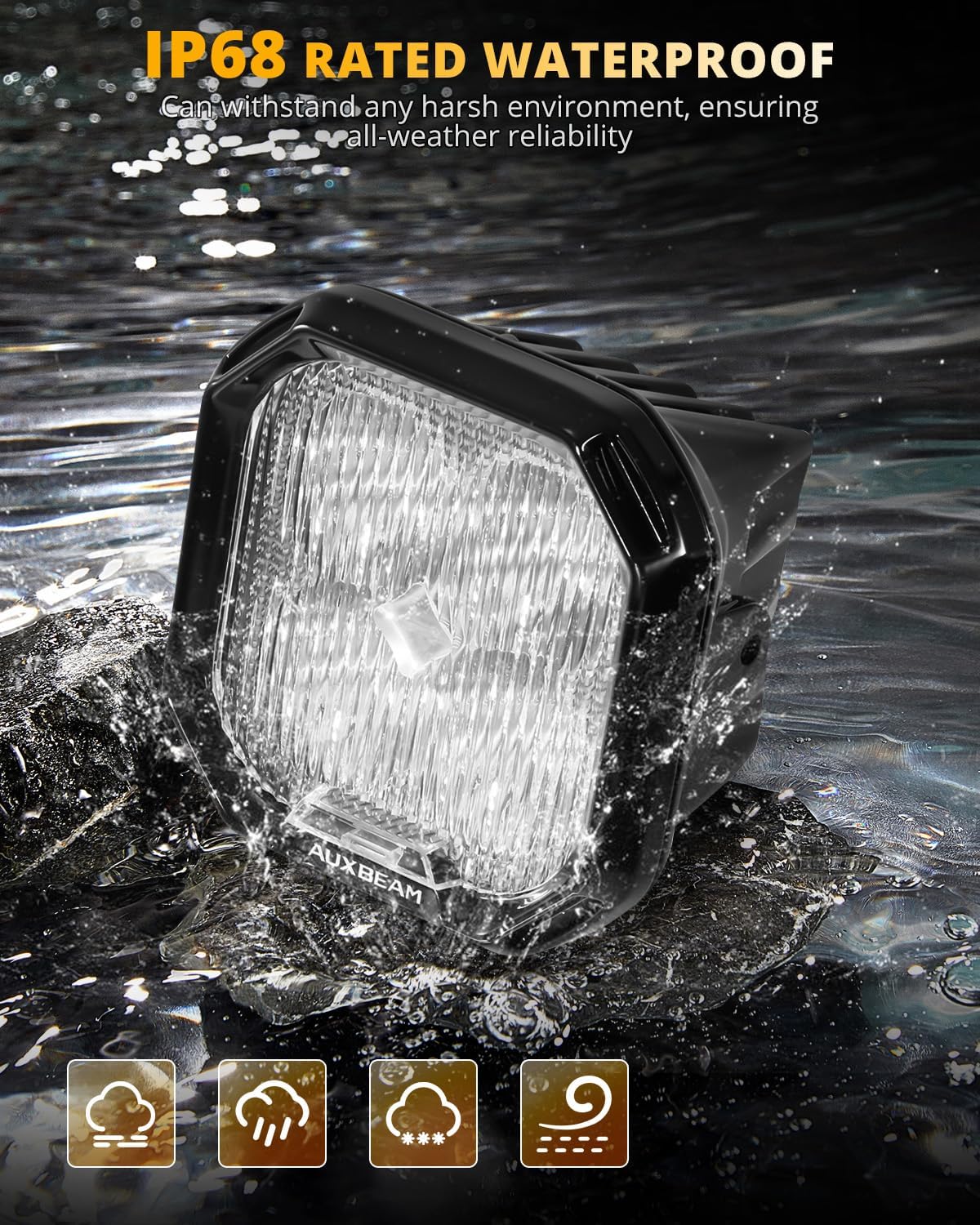 - ใUNSTOPPABLE IN ANY CONDITIONใRain, snow, mud, or dustโour IP68-rated LED pods are built to endure. Featuring a military-grade breather system to prevent condensation and dust intrusion, auxbeam led fog light stay crystal clear no matter the terrain. While your tires might struggle, your vision wonโt. Conquer every storm with confidence and clarity