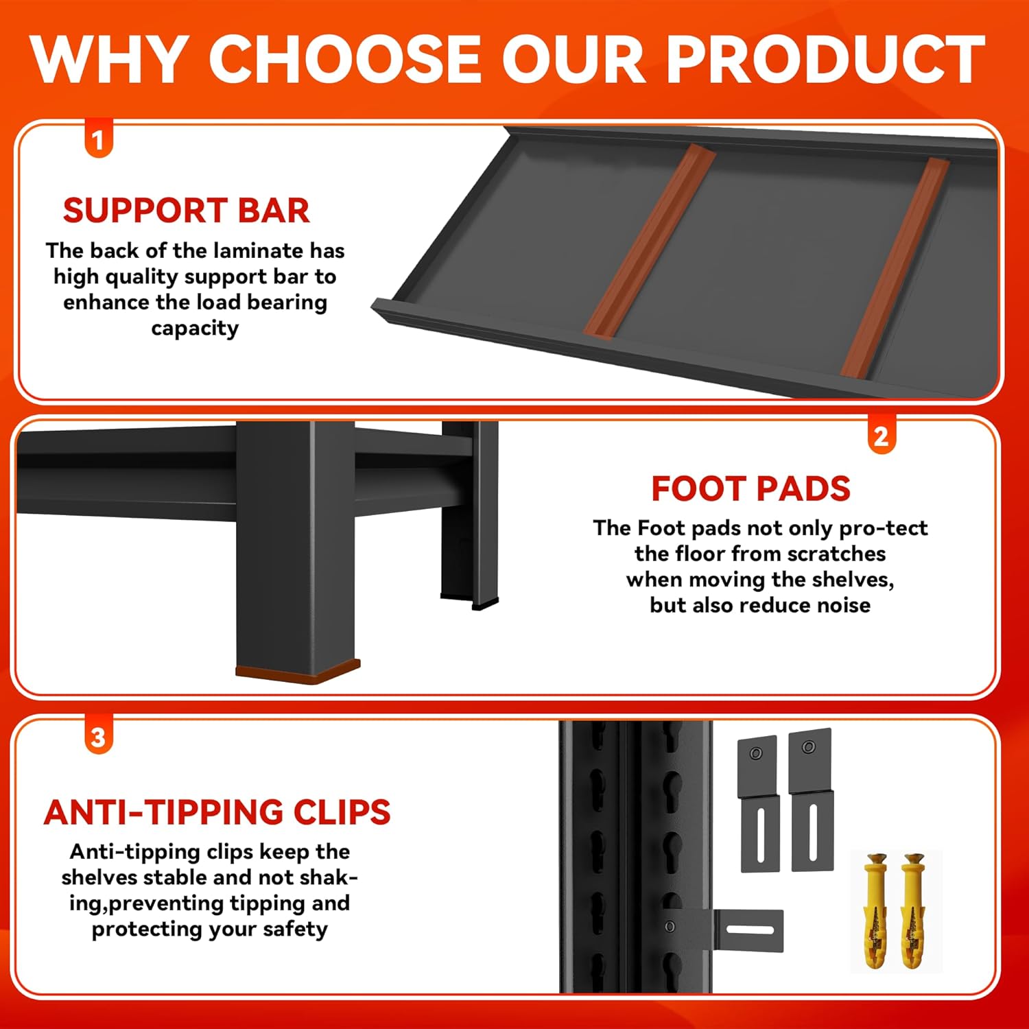 - 【Extremely Sturdy & Durable Garage Shelving】Constructed from high-strength premium cold-rolled steel with advanced powder-coated technology, this metal shelving unit resists rust, oxidation, and wear. The industrial-grade coating not only enhances aesthetics but also boosts durability, making it a heavy-duty shelving solution for long-term use