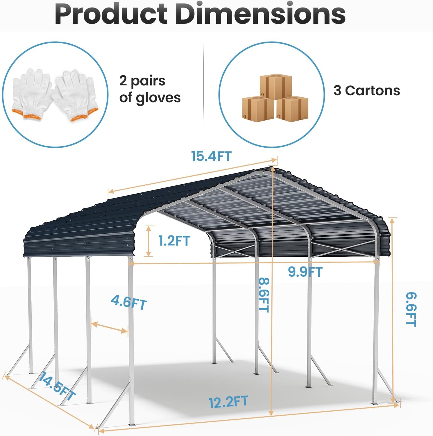 10x15 Ft Carport, Heavy Duty Metal Car Port, All-Weather Protection, Easy Assembly for Cars, Trucks, Boats, Tractors, and Outdoor Storage
