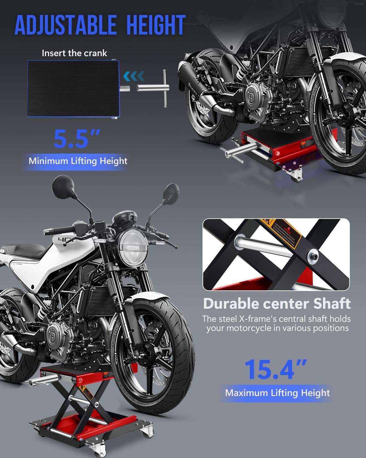- Adjustable Lift Range & High Capacity:Supports up to 1100 lbs with an adjustable lift height range of 5.5"-15.4" (with dolly) or 3.7"-14" (without dolly)., accommodating a variety of motorcycles, dirt bikes, and ATVs while providing an ergonomic working height for safer and more efficient repairs.