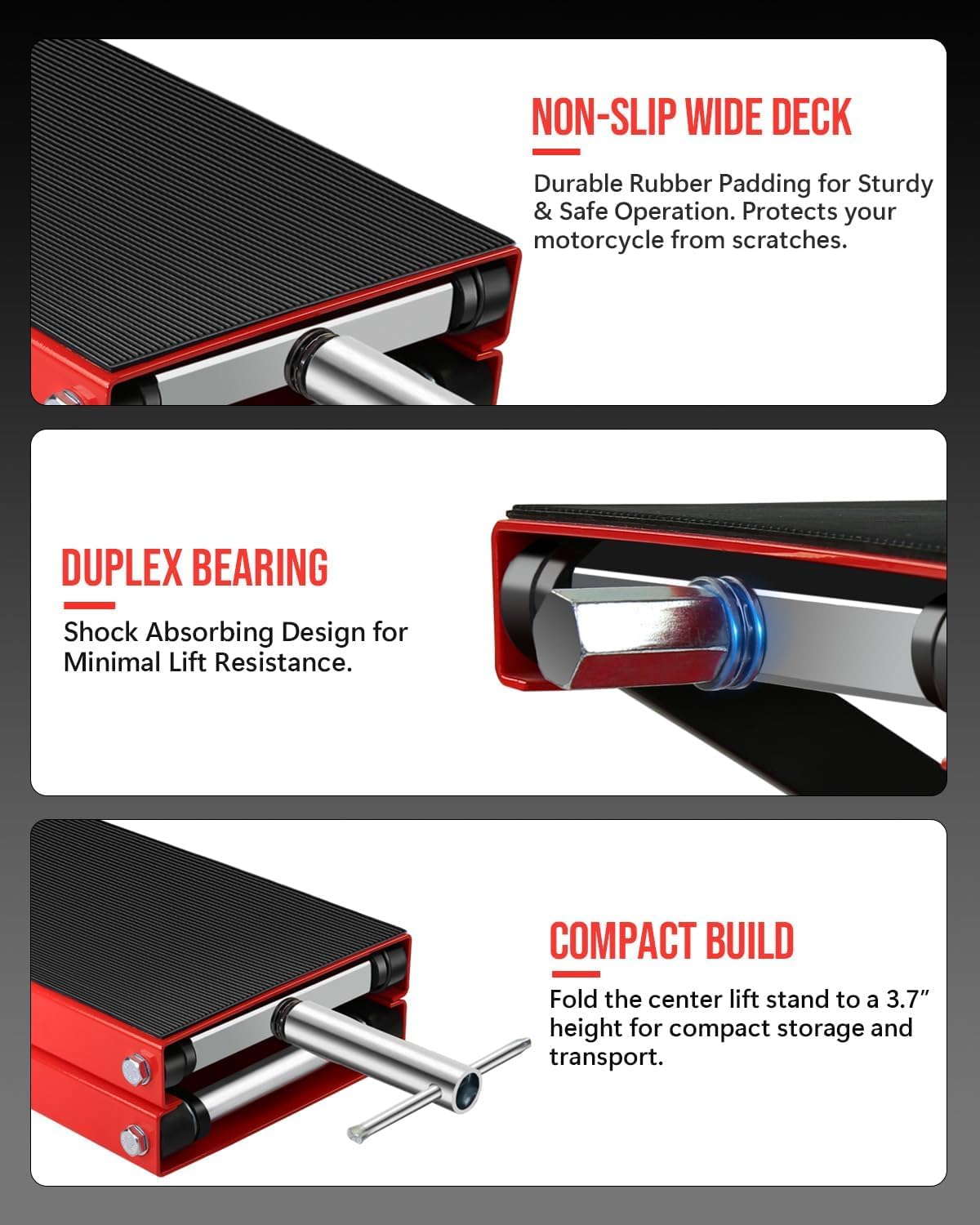 - 【Safe & Stable Lift】:Equipped with a non-slip rubber saddle featuring a textured pattern, the wide top platform securely holds your motorcycle, preventing scratches and slippage during lifting and maintenance operations.