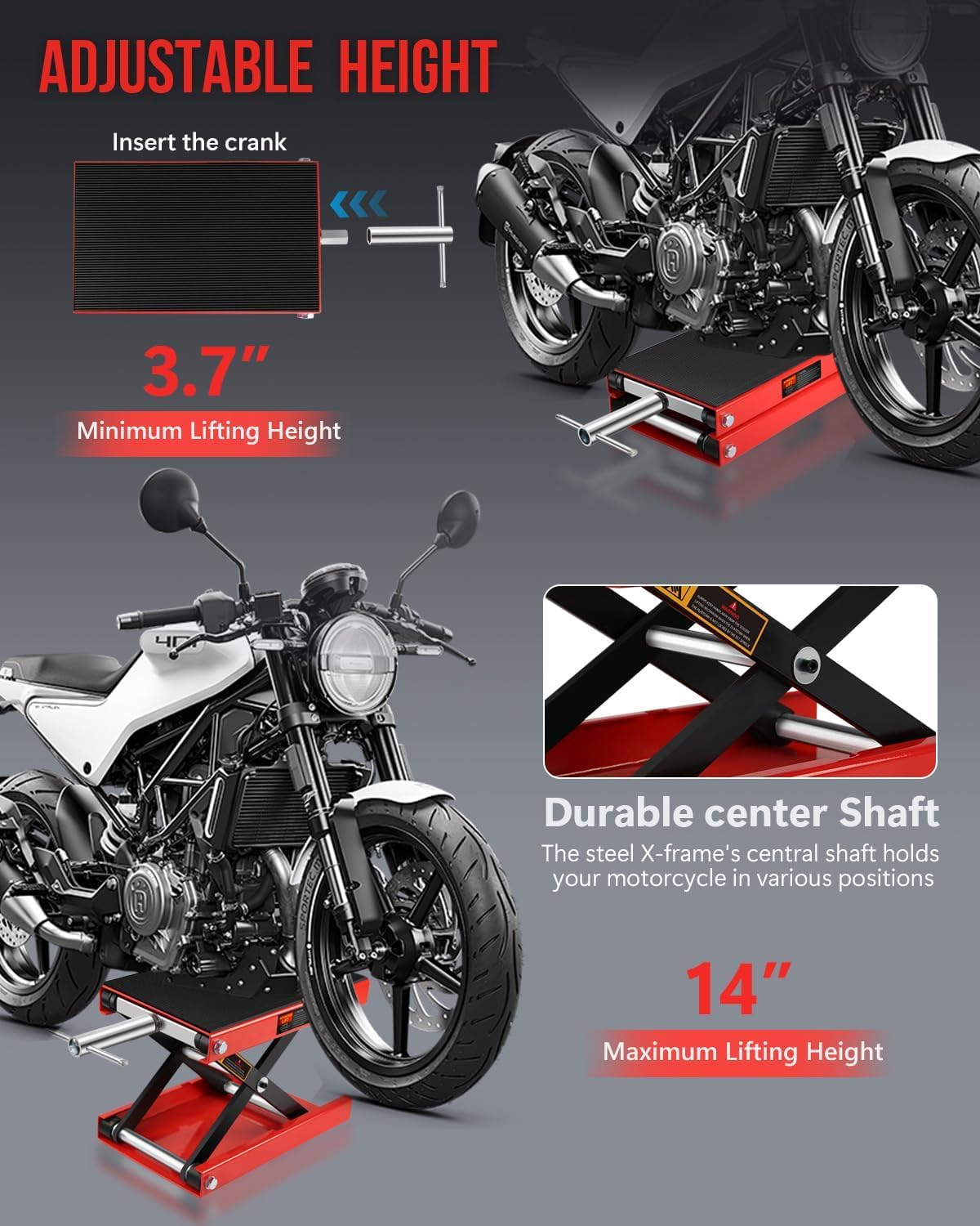 - 【Wide Lift Range & High Load Capacity】:Supports motorcycles up to 1100LBS and offers an adjustable lift height range from 3.7" to 18.7", providing flexibility to raise your bike to the ideal working height for repairs and garage maintenance.