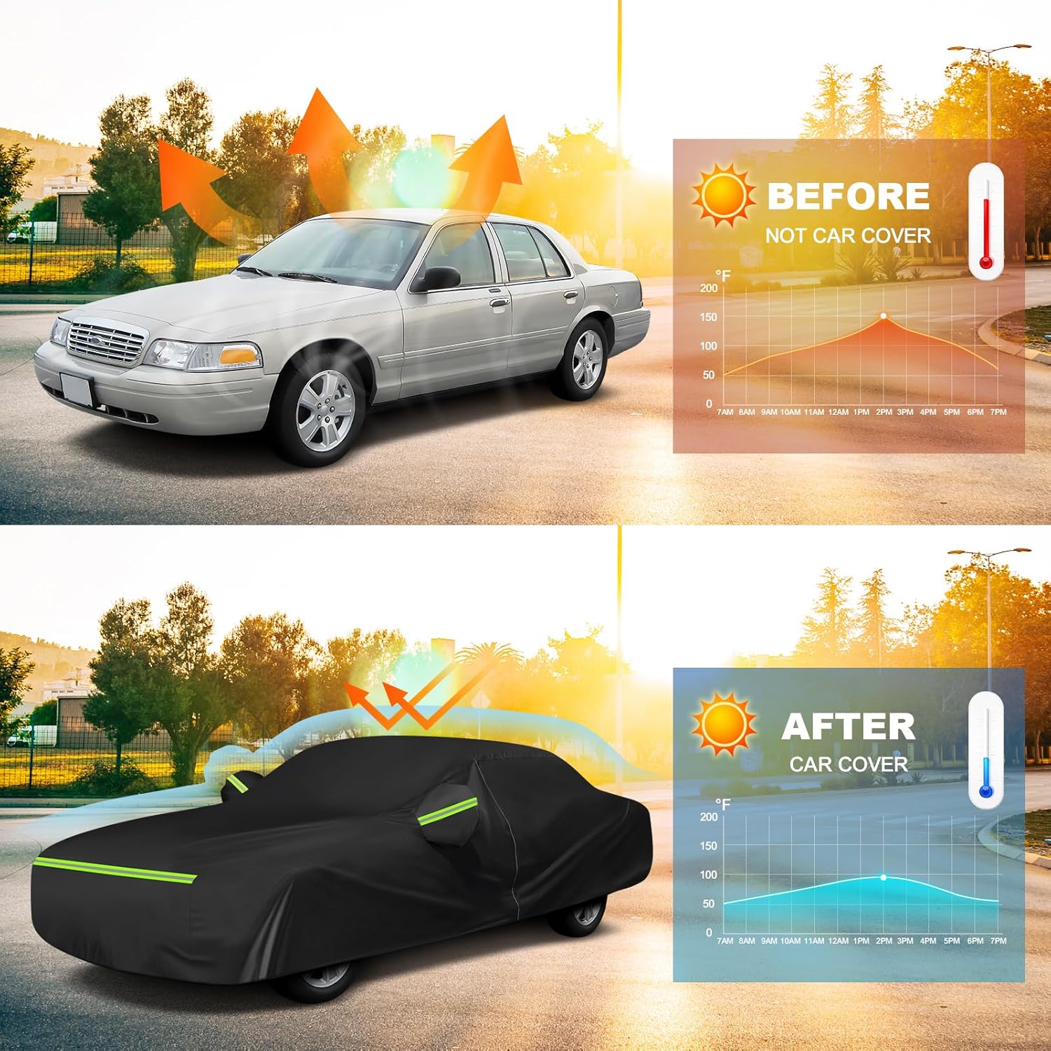 - 【All-Weather Protection】The crown victoria cover features durable 210D Oxford fabric with a cotton-lined interior, engineered to resist tears and scratches. This premium cover protects your vehicle's paint from rain, snow, sun exposure, bird droppings, and dust/dirt—delivering reliable all-season protection.