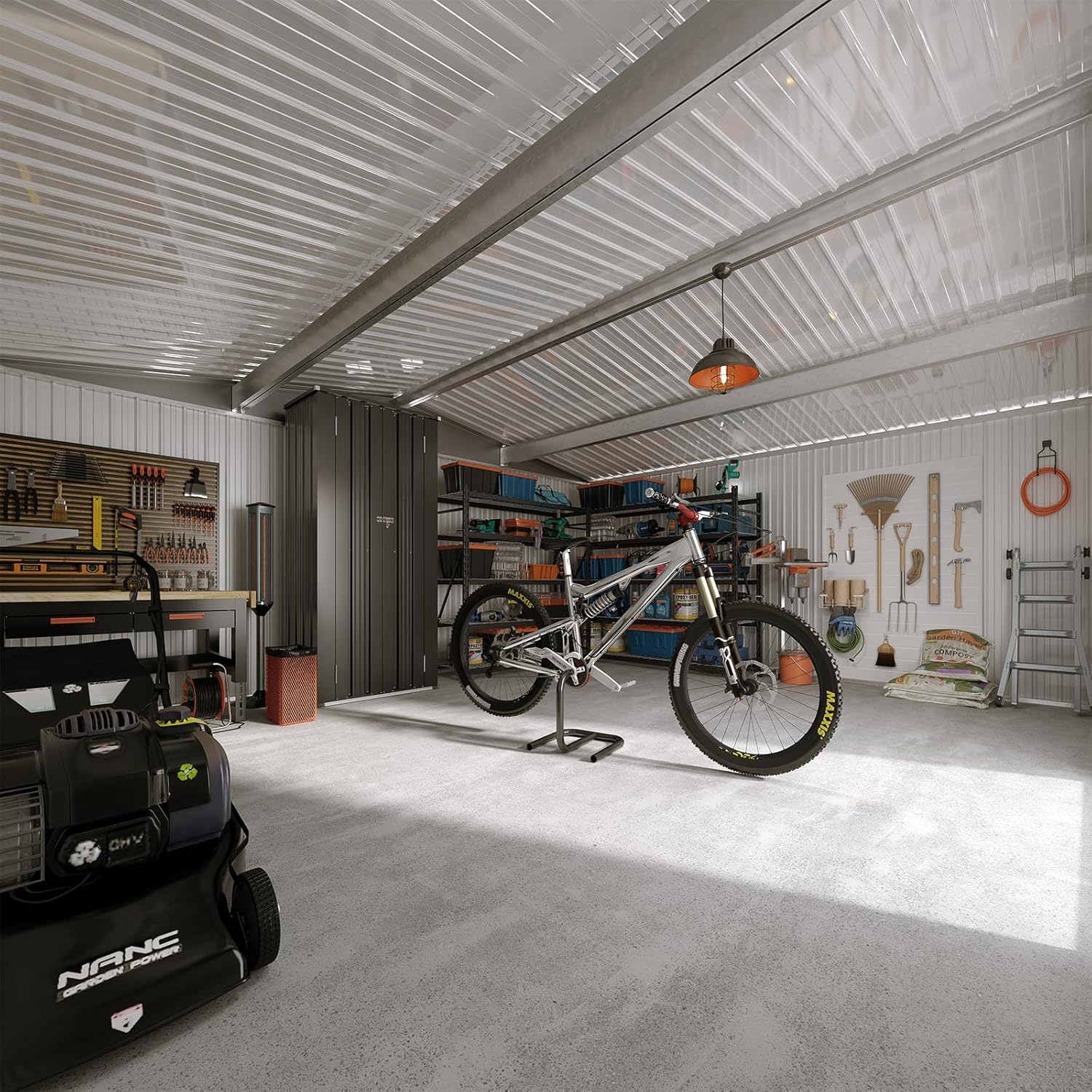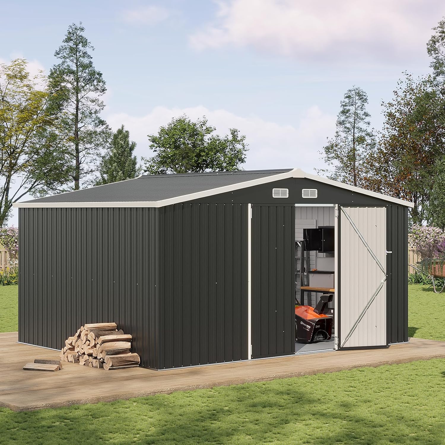 - Multiple Storage Modes: The Outdoor storage shed, measuring 12x10 FT, offers ample space(Internal capacity up to 560CU.FT) for all your outdoor storage requirements. This durable metal garden shed is applicable for storaging accommodate snow blowers, shovels, outdoor chairs, bicycles, and toy cars.Additionally, you can consider purchasing storage racks to optimize the organization of items such as shovels, umbrellas, antennas, escalators and more on this versatile outdoor storage solution
