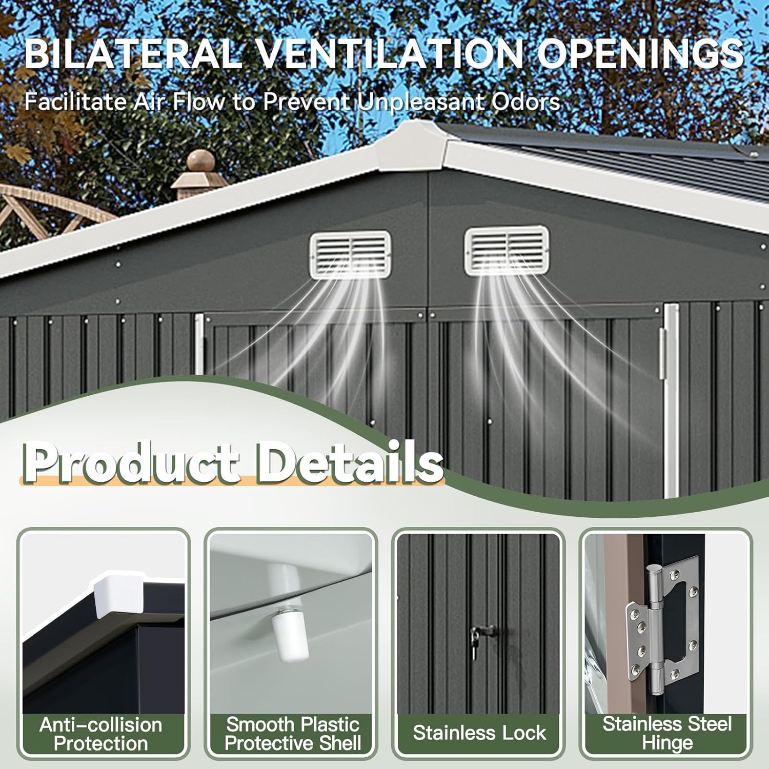 - Sloping Roof & Lockable Doors: The sloping roof design not only maximizes the utilization of space, but also effectively prevents the accumulation of rainwater on the top surface over an extended period of time. Additionally, the incorporation of specially designed air vents ensures optimal ventilation. Furthermore, the inclusion of pad-lockable doors facilitates convenient access to stored items while enhancing overall safety