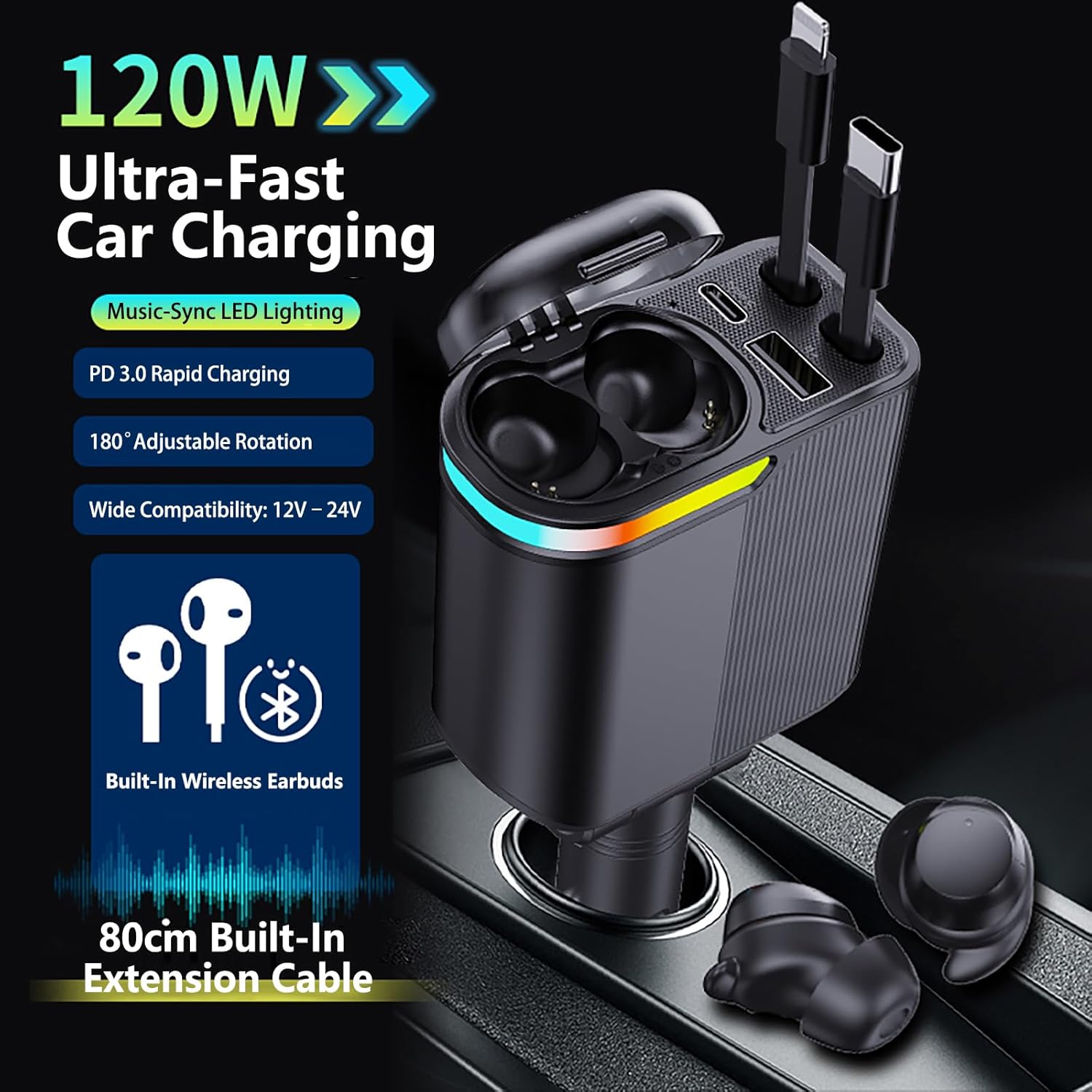 - 【120W Earbuds Car Charger 】:Car Charger with Earbuds. The 4 in 1 car charger equippes with a real PD 120W Type-C retractable cable (fast charging port), and IOS retractable cable, and additional USB-C and USB-A ports, this charger offers fast charging for up to four devices simultaneously.