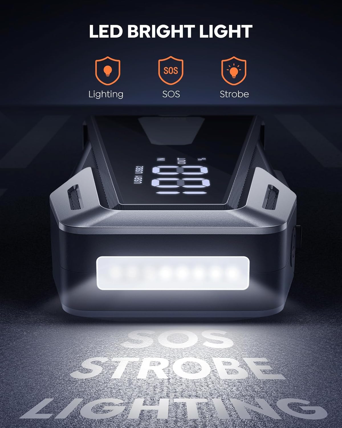 - 【Advanced Large Display】5" LCD display enables the operation status of the jump pack and battery power at a glance! The integrated screen design of the fuselage makes the car jump starter more concise and modern, which also has the outdoor protection function of rainproof and dustproof. Metal texture edge promote better durability.