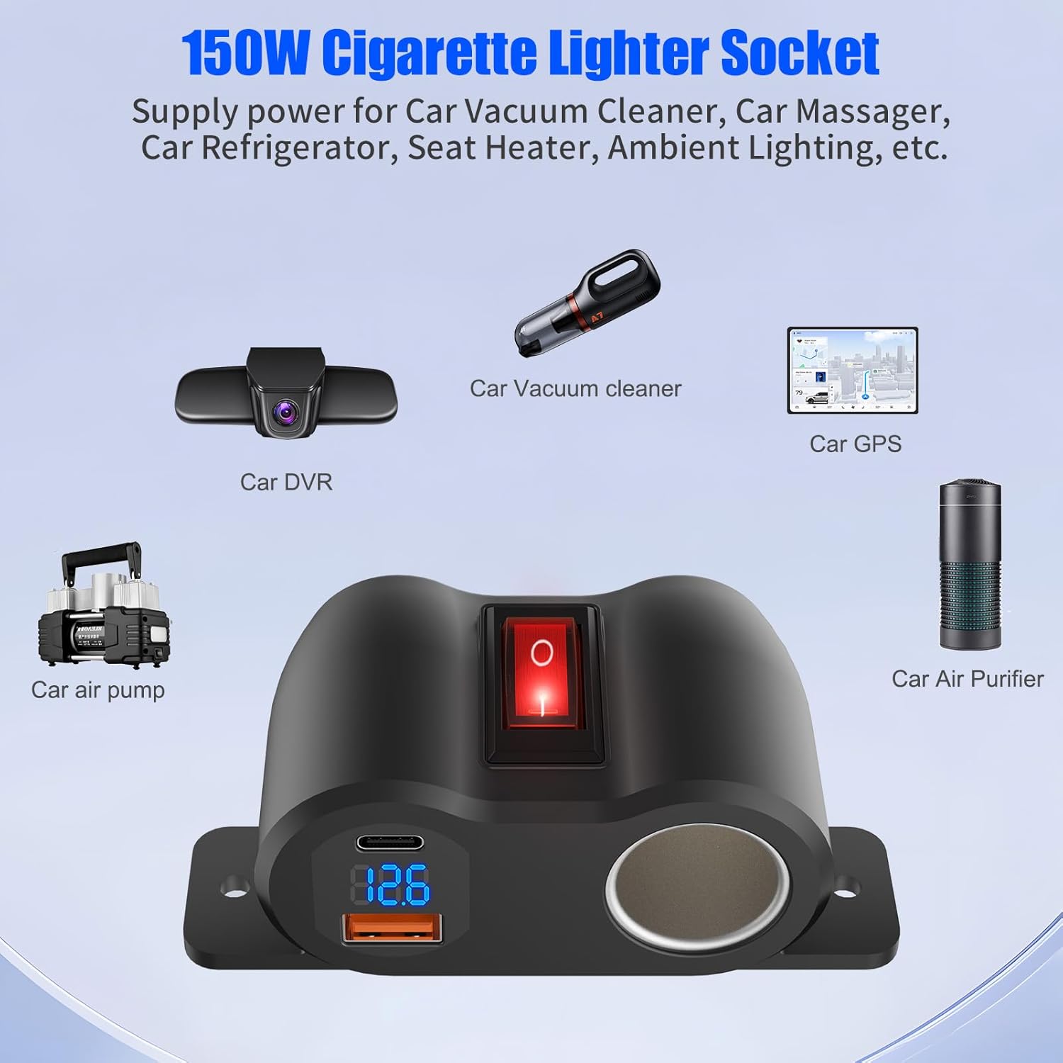 - 120W Cigarette Lighter Socket: The cigarette lighter socket has a total power of up to 120W, which is enough to meet the needs of daily use, and can be perfectly matched with compatible devices such as dash cam, GPS, vacuum cleaner, air purifier, radar detector and so on.
