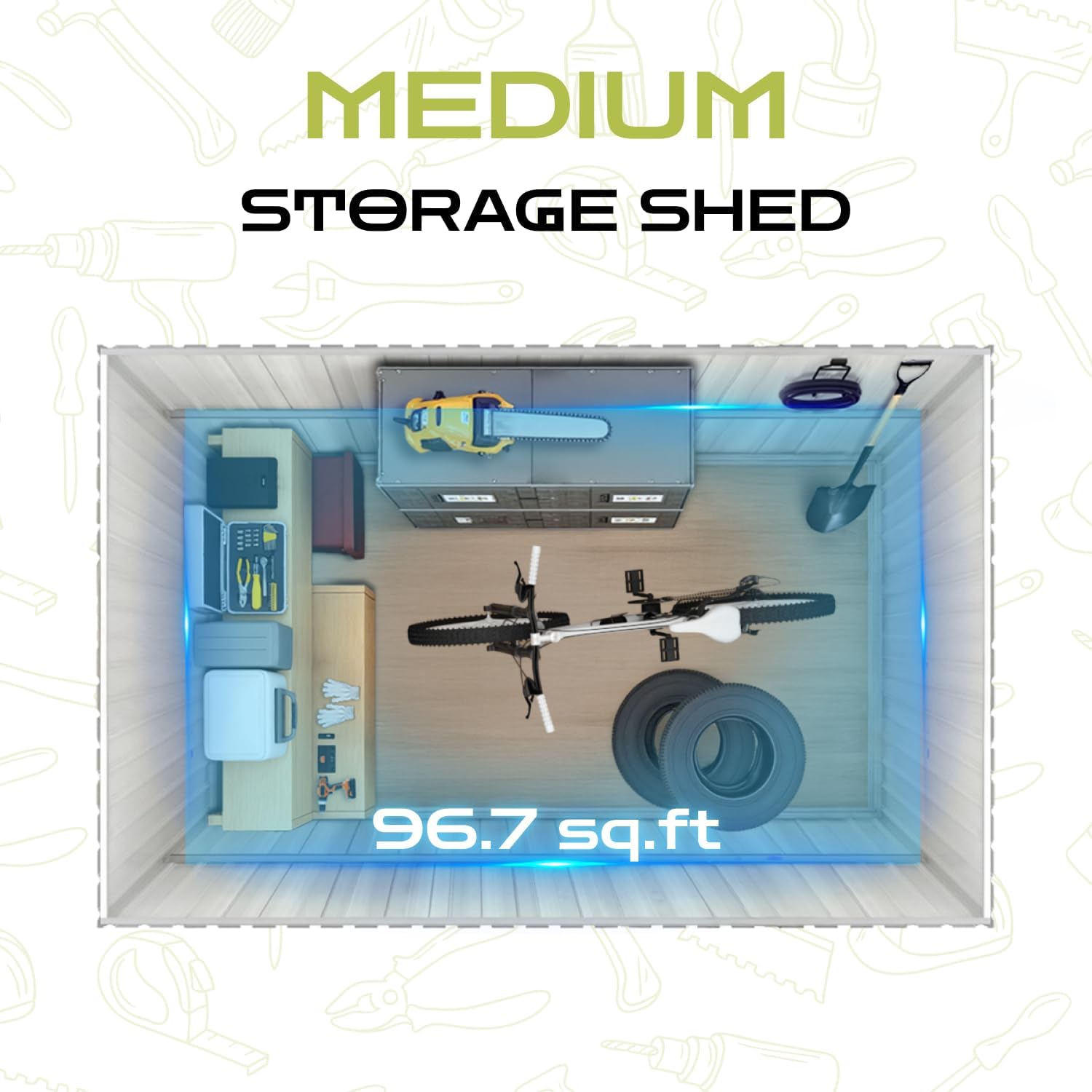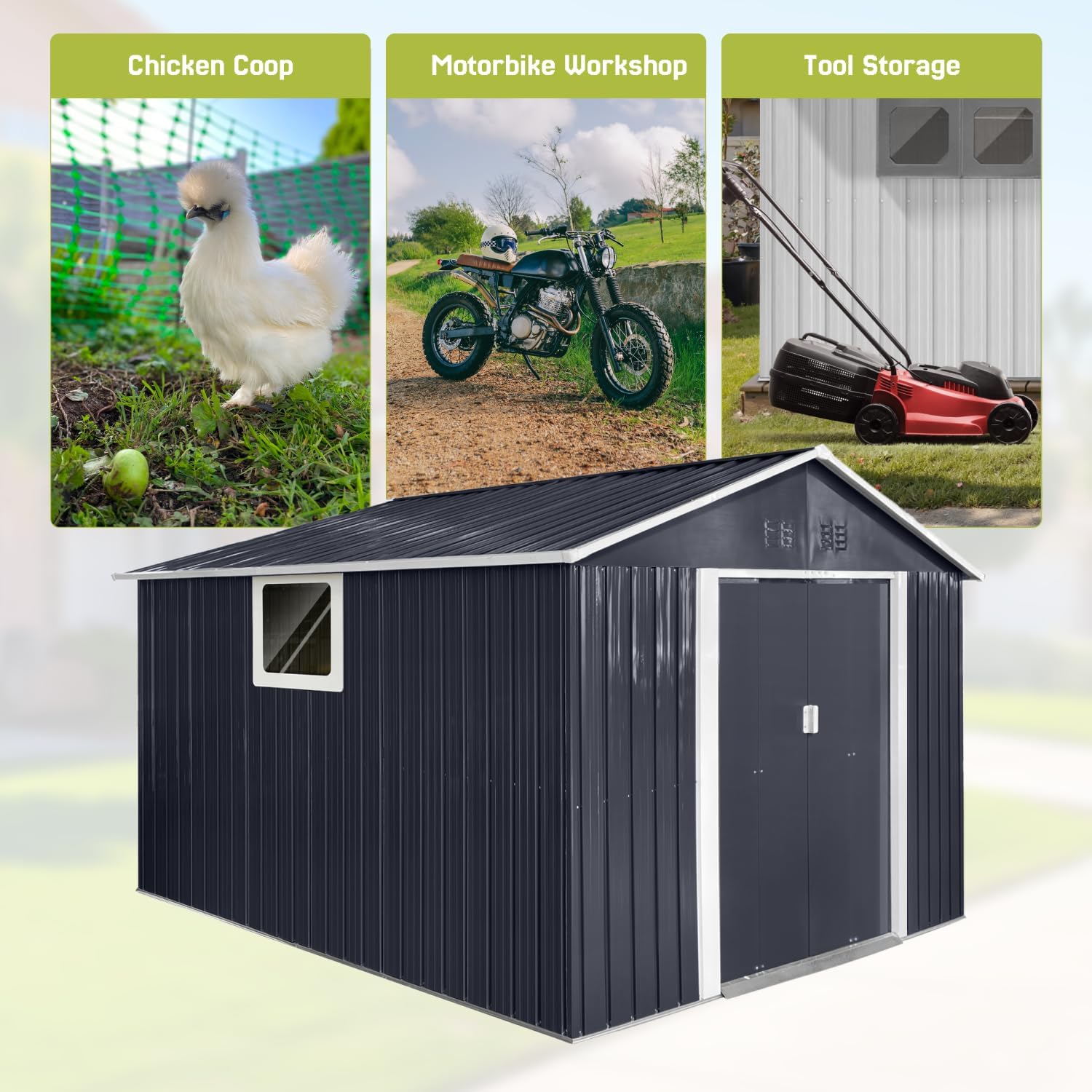- 【Spacious & Multi-Functional】This 96.46 sq.ft outdoor storage shed offers versatile space for gardening tools, seasonal gear, or as a compact workshop, featuring 4 vents and a translucent window to prevent humidity damage