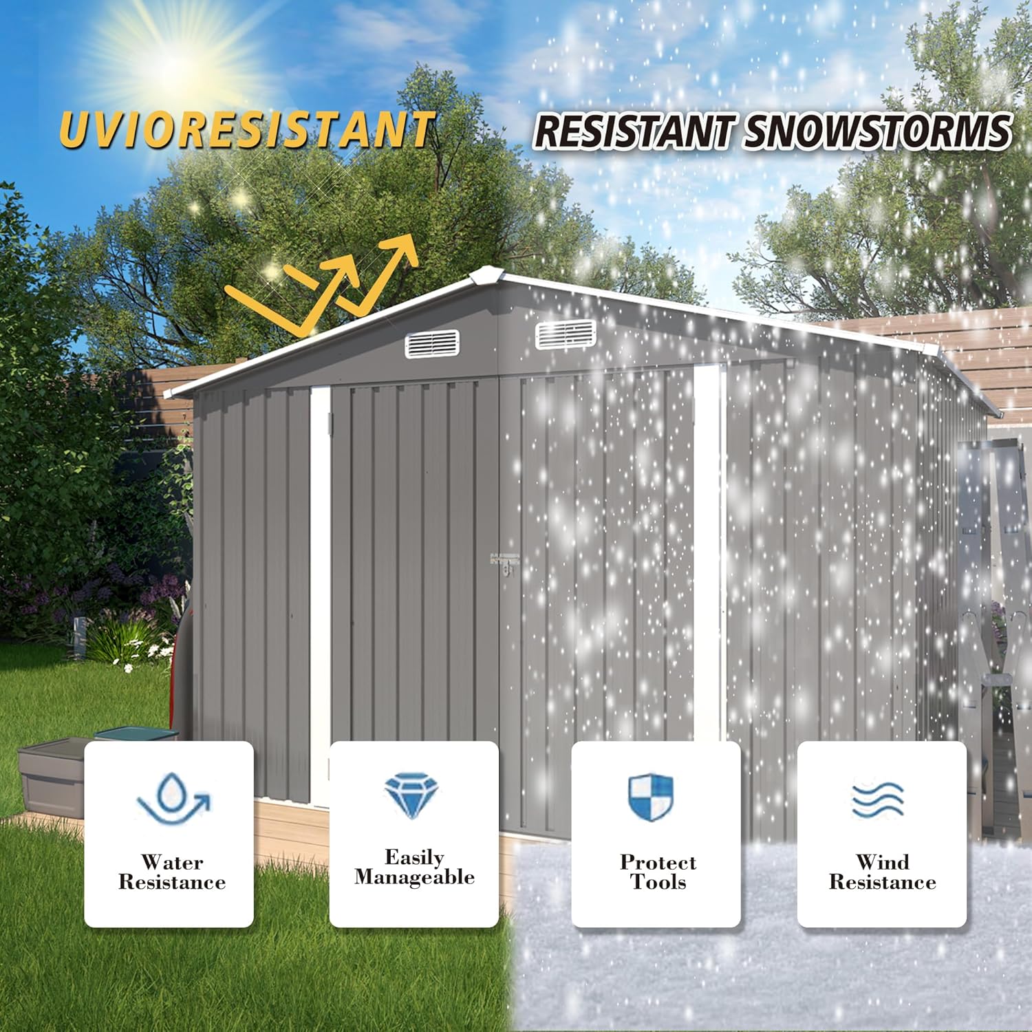 10x8x6.4FT Outdoor Storage Shed, Galvanized Steel Garden Shed with Lockable Door & Window, Waterproof Metal Tool Storage for Garden, Backyard, Patio, Lawn(Grey)