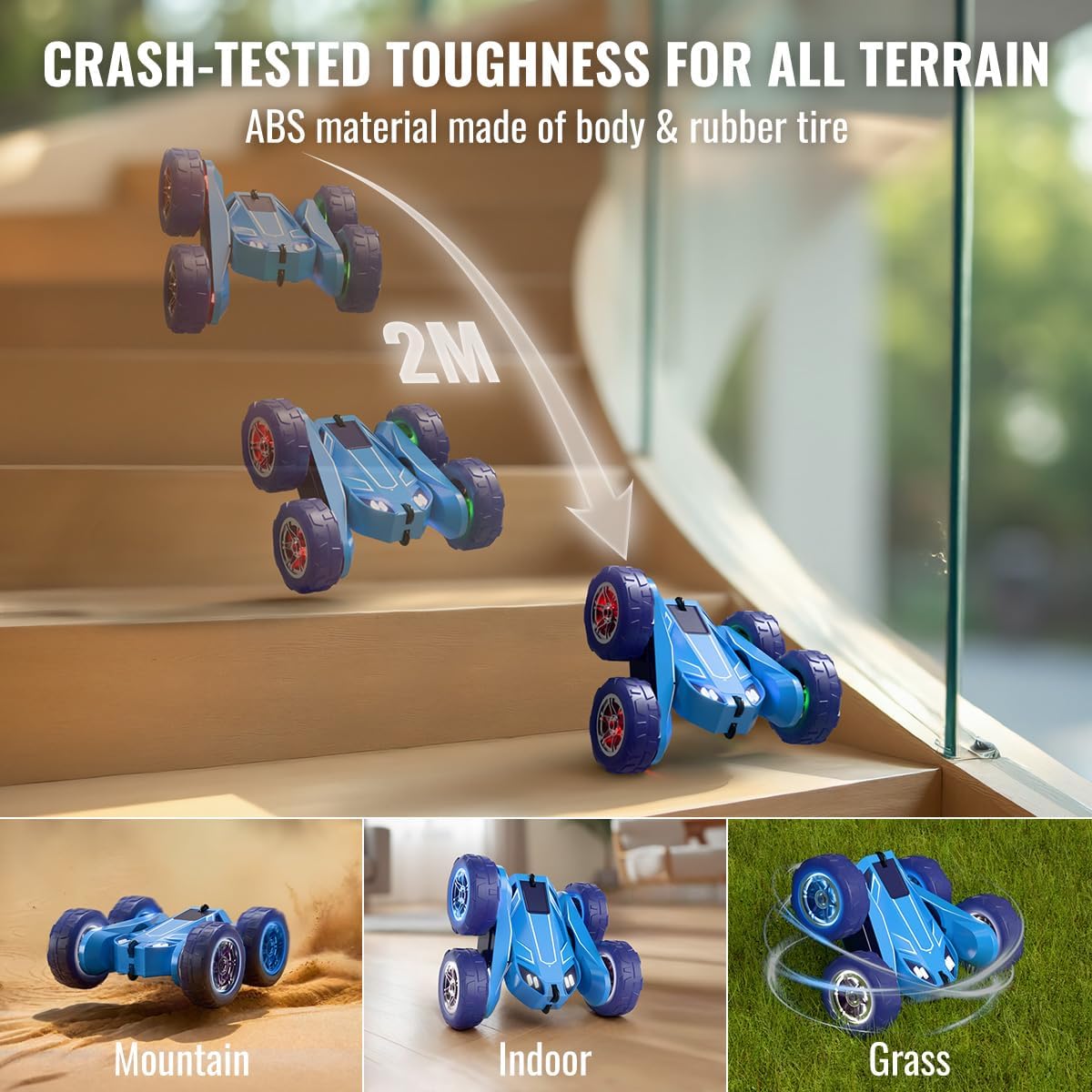 • Thrilling Stunts & All Terrain - Builted Master ​360° spins, 180° flips, and double-sided driving for endless stunt excitement. Powerful motor enables it unleash 20km/h high speed on rough terrain with 4WD traction and durable rubber tiers for maximum grip and shock absorption.