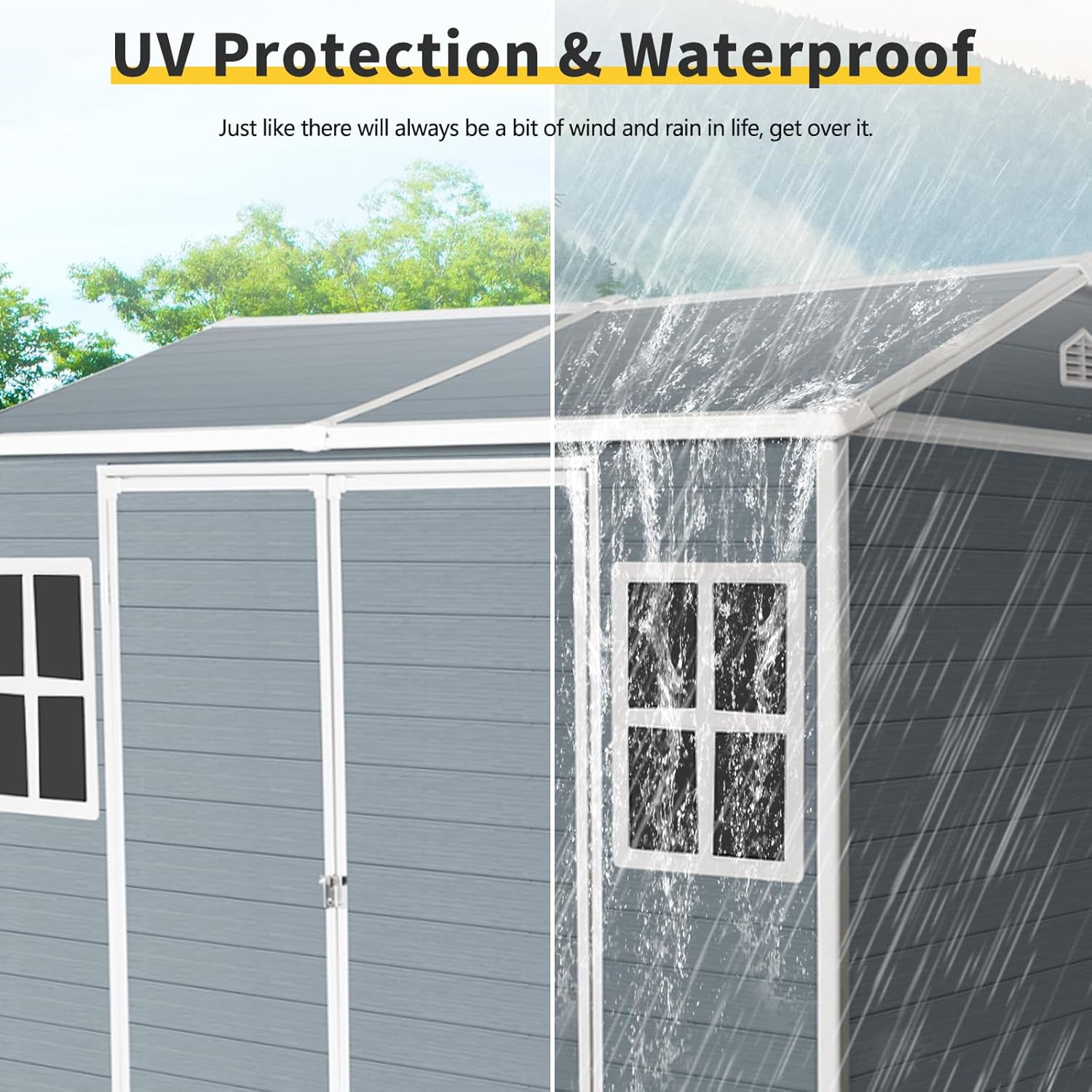 - ๐ก๐๐ฎ๐ฅ๐ญ๐ข-๐๐ฎ๐ง๐๐ญ๐ข๐จ๐ง๐๐ฅ ๐๐ฌ๐: The sloped roof of this 8x6 resin storage shed effectively prevents water leaks and snow buildup. Two high-definition clear 4-pane windows let in soft natural light, while dual ventilation vents improve airflow to keep contents dry. It's not just a secure space for garden toolsโit also works as an outdoor workshop or cozy pet house.