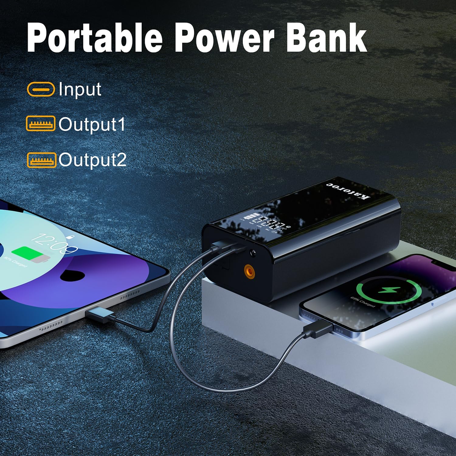 - 【CORDLESS INFLATOR & SMART DISPLAY】The jump starter with air compressor quickly inflates a car tire to 30 PSI in just 2 minutes, faster than most jump starter in the market. Equipped with 3 different nozzles & 4 selectable units (PSI, BAR, KPA, KG/cm²) for cars, bicycle, bikes, motorcycle, balls etc. The display screen can display the tire pressure and power in real time, easy to inflate your cars. Do not need to worry about the tire pressure after you purchased our jump starter.