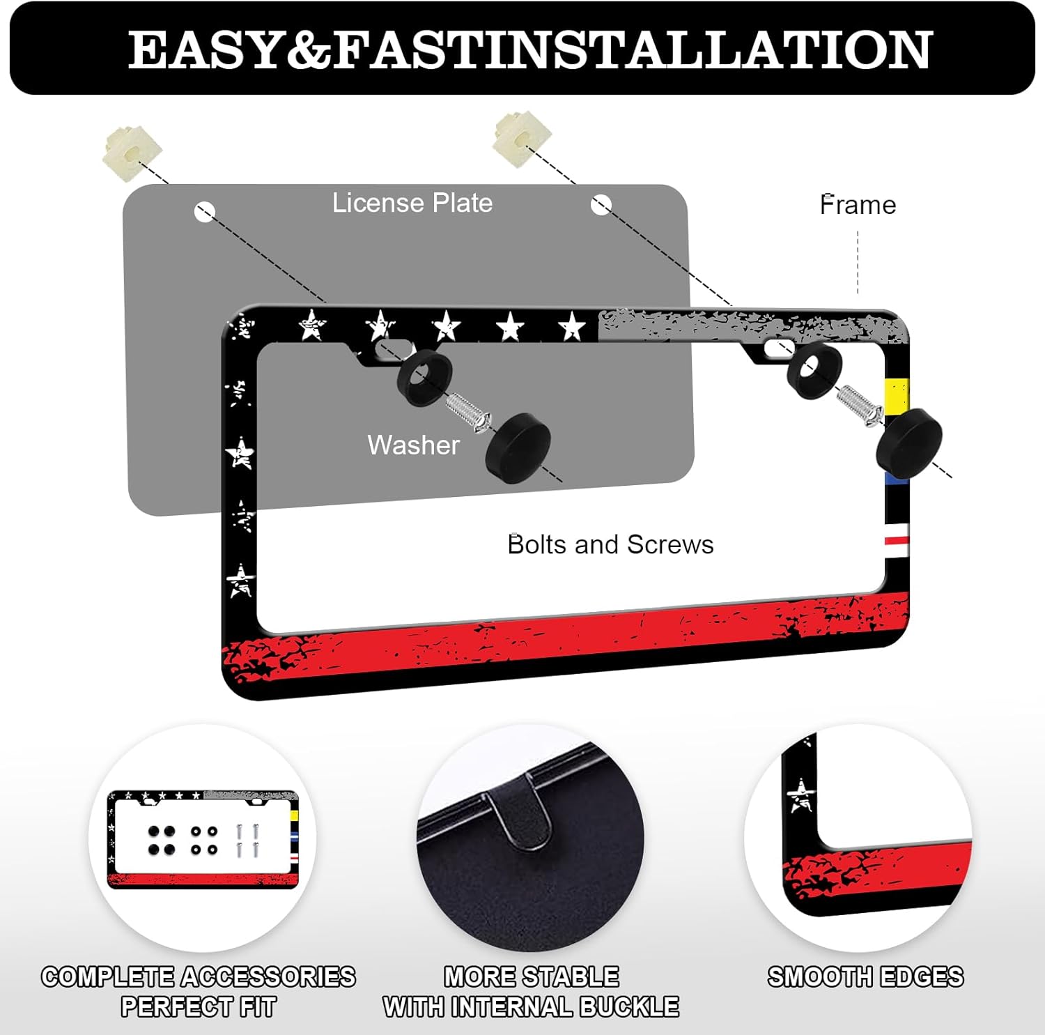 American Flag License Plate Frames - 2 Pack Colorful US Flag Stainless Steel License Plate Holder,Rust-Proof Waterproof Car Decorative Tag Frame with Screws Fasteners Caps