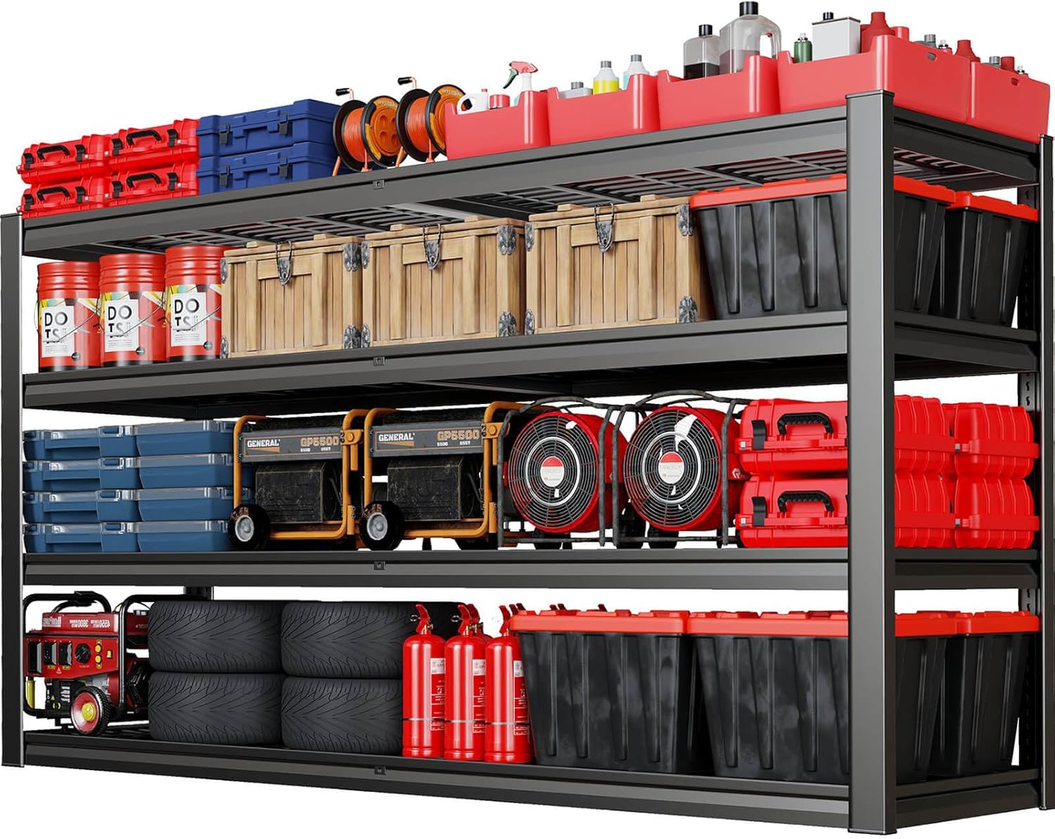 - 【Perfect for Multi-Scenario Storage】Ideal for garage shelving, workshop storage, or commercial shelving needs, this 67-inch-wide unit effortlessly organizes automotive parts, power tools, bulk supplies, or seasonal gear. Its double-layer wire decks and adjustable 4-tier design adapt to garages, warehouses, basement or shop shelves, while the 750 lbs/shelf capacity and wobble-free structure ensure safe, space-saving storage for heavy or oversized items.