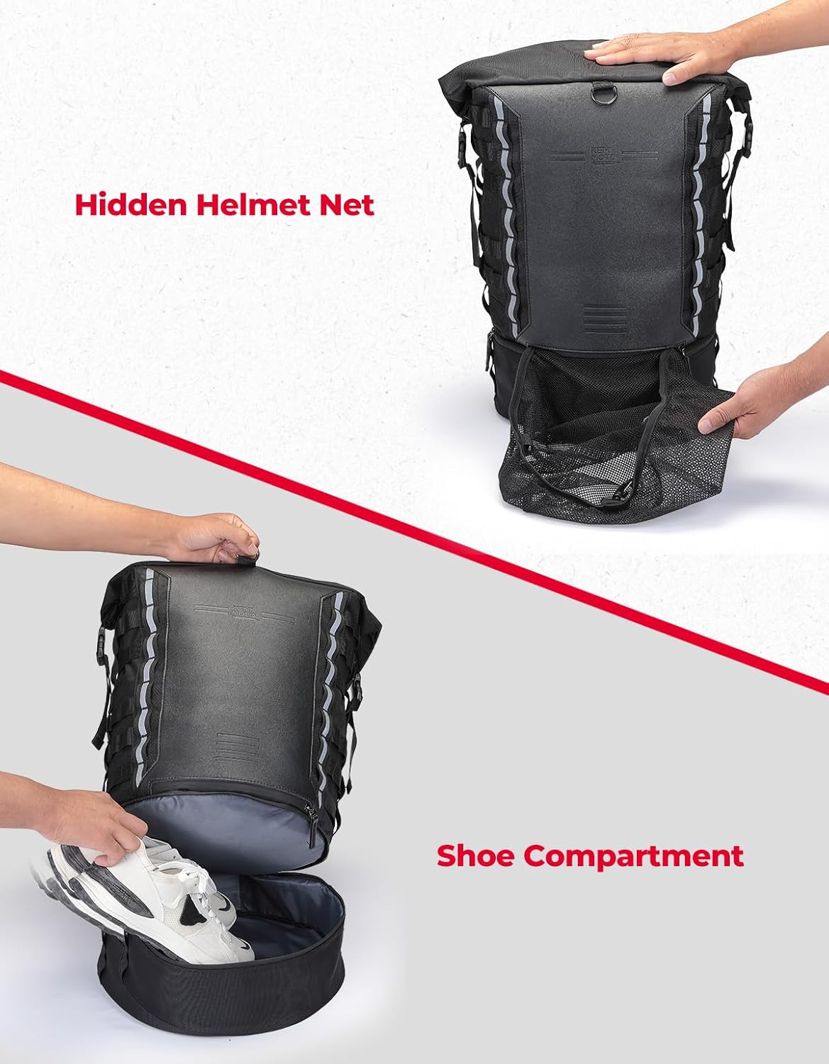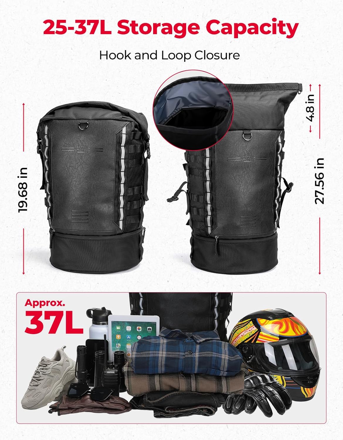 - 25L-37L Large Capacity: This motorcycle sissy bar backrest bag features a rolled up cover design that can easily accommodate motorcycle equipment,tools or travel items. There is a compartment at the bottom for storing shoes and a hidden helmet net which can fit most helmets. Therefore, this motorcycle tail bag can be used as a motorcycle luggage rack bags or motorcycle helmet backpack
