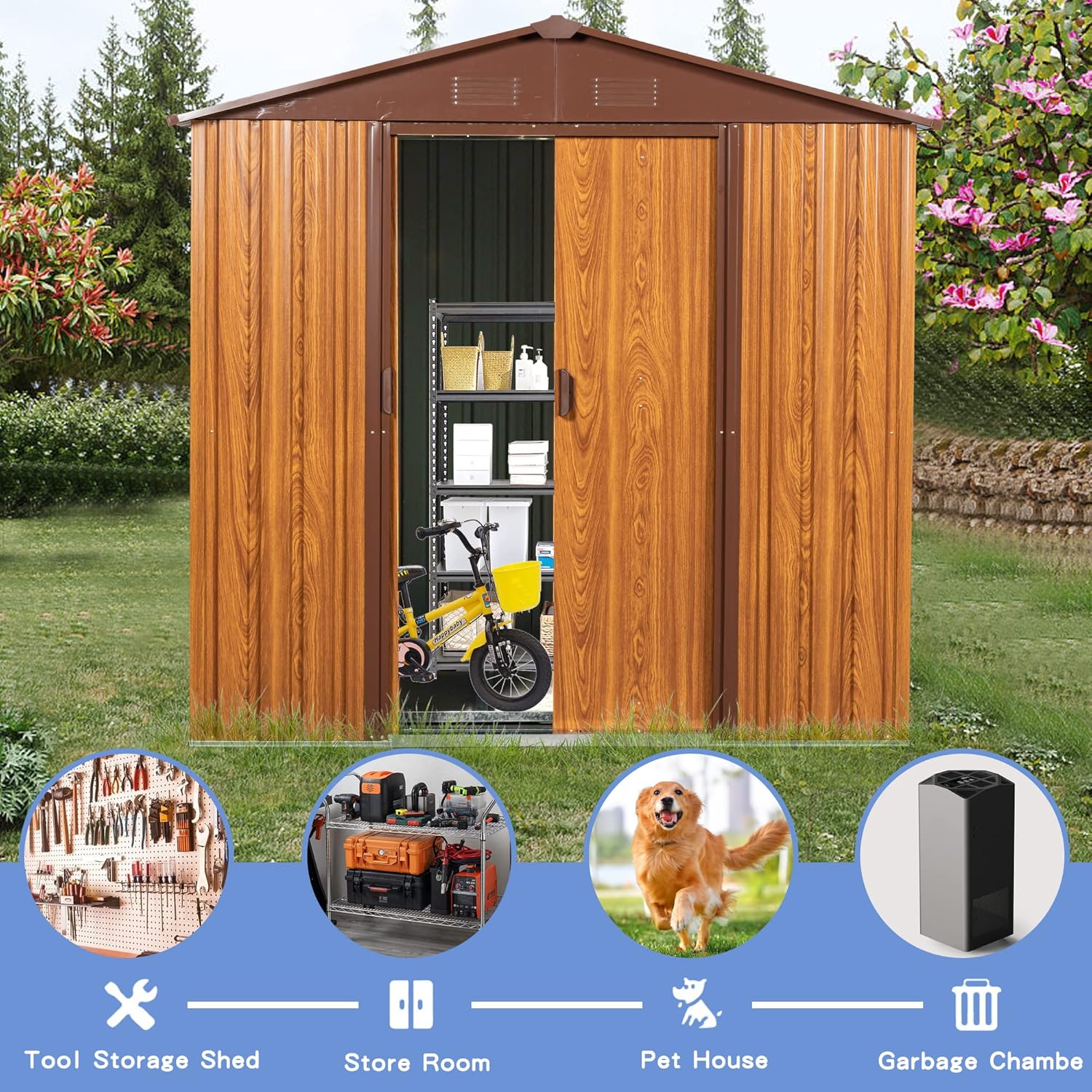 - ๐ก๐๐ฅ๐ฅ-๐ฐ๐๐๐ญ๐ก๐๐ซ ๐๐ญ๐จ๐ซ๐๐ ๐ ๐๐ก๐๐: Our metal shed 6x6 features sliding doors that open and close smoothly, with handles and a heavy-duty lock for added security. It serves not only as a safe space for storing garden tools but also as a warm pet house. The sloped roof of the storage building effectively prevents leaks and snow accumulation, while the four integrated punched vents improve airflow, helping to keep your items dry.