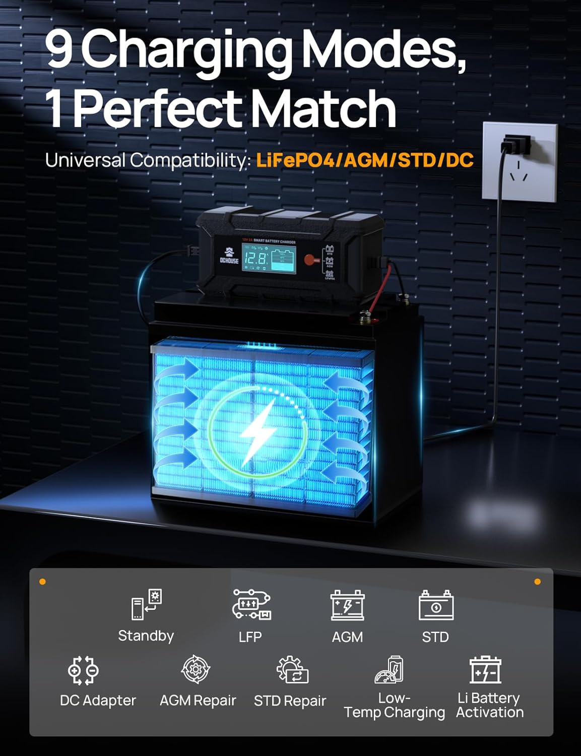 DC HOUSE 5A Battery Charger, 12V Smart Lithium Battery Charger for LiFePO4 & Lead Acid, Trickle Charger Maintainer and Desulfator for Car, Motorcycle, Automotive Batteries