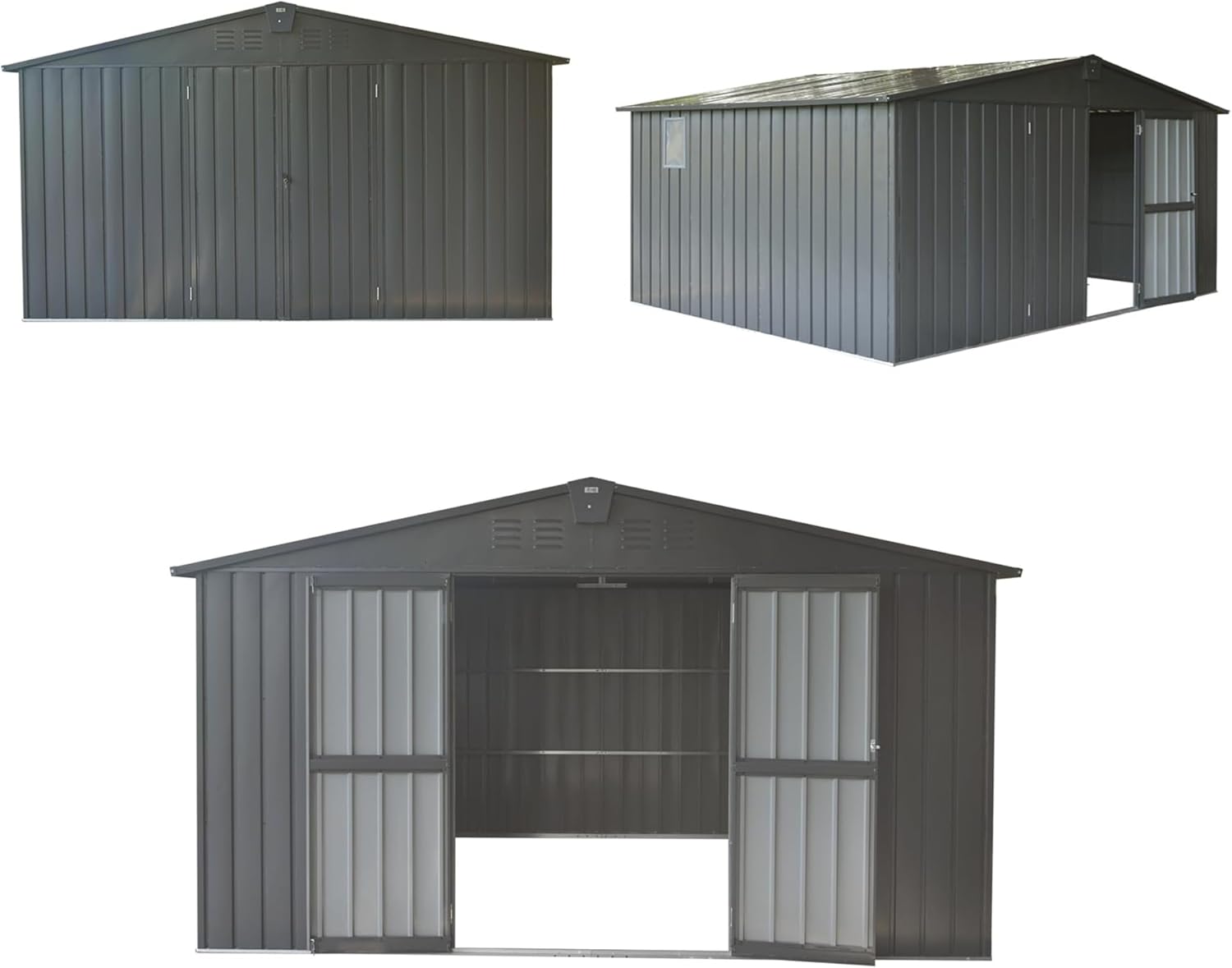 IKERY Large Galvanized Steel Storage Shed 11' x 9' with Windows & Lockable Door - Outdoor Garden & Utility Tool Shed for Backyard, Patio - Dark Gray
