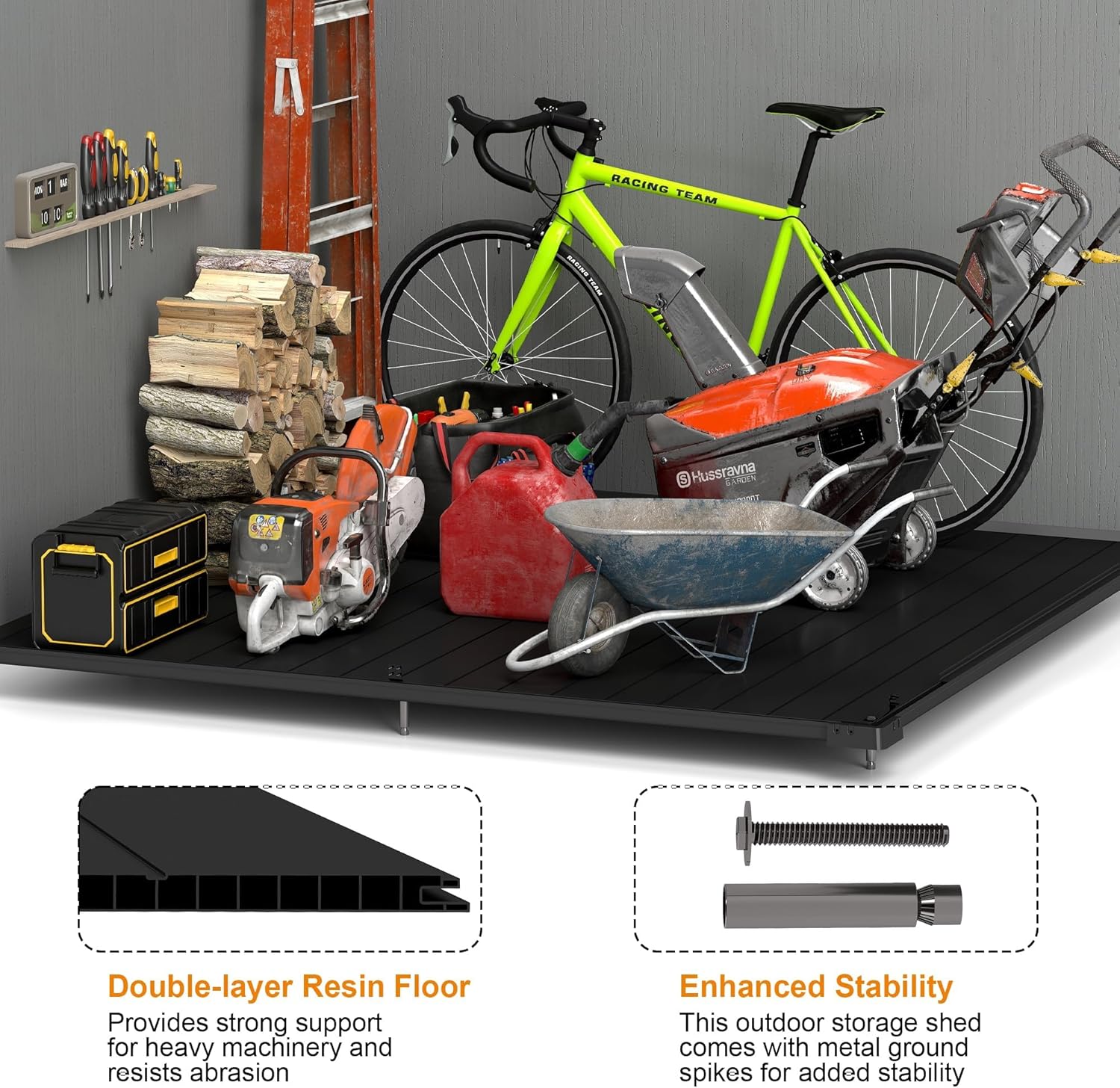 - Robust Double-Layer Floor : The double-layer resin floor provides strong support for heavy machinery and resists abrasion. This ensures your tools and lawn equipment remain protected and the shed stays stable on level grounds.