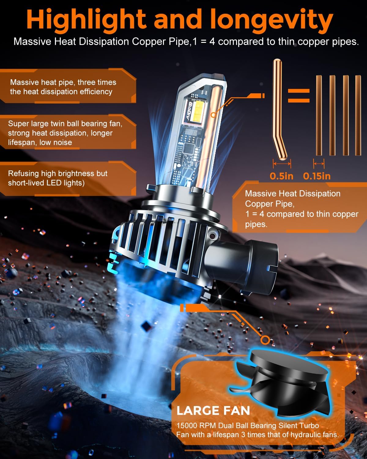 - [As Bright As New After 3 Years] Extreme heat dissipation ensures that the lights always run at a low temperature of 180°F (normal bulbs without heat dissipation are 280-300°F) After 10,000 consecutive hours of continuous lighting test, the brightness decreases by less than 2%, with a total lifespan of more than 10 years, even if you drive for 10 hours a day at night, the lights will still be as bright as brand new after 3 years.
