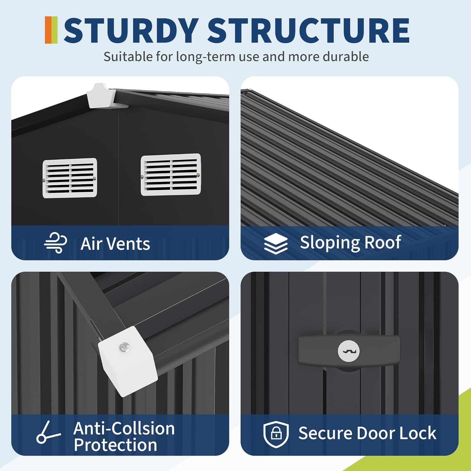 - Sloped Roof & Lockable Door & Air Vents: The sloped roof is engineered to enable rapid drainage of rainwater. The lockable doors serve to bolster security, warding off both strangers and small animals from unintended entry. The incorporation of air vents is a strategic design choice that significantly boosts air circulation. This, in turn, safeguards your stored items against growth and damage during sweltering and humid summers. Additionally, plastic protective caps are furnished for the s