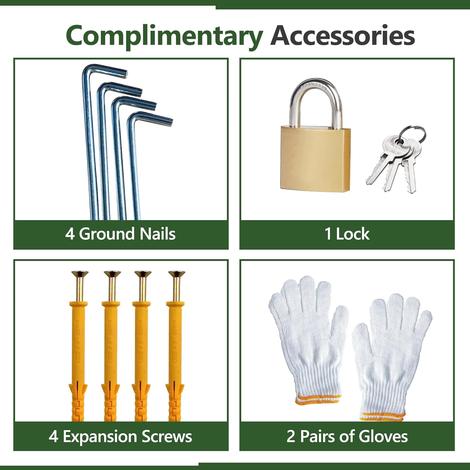 - Durable and Sturdy: This metal storage shed is made of high-quality galvanized steel, which is sturdy and durable, with stronger corrosion resistance, UV resistance and moisture resistance, stronger wind and impact resistance, and can be used for a long time.