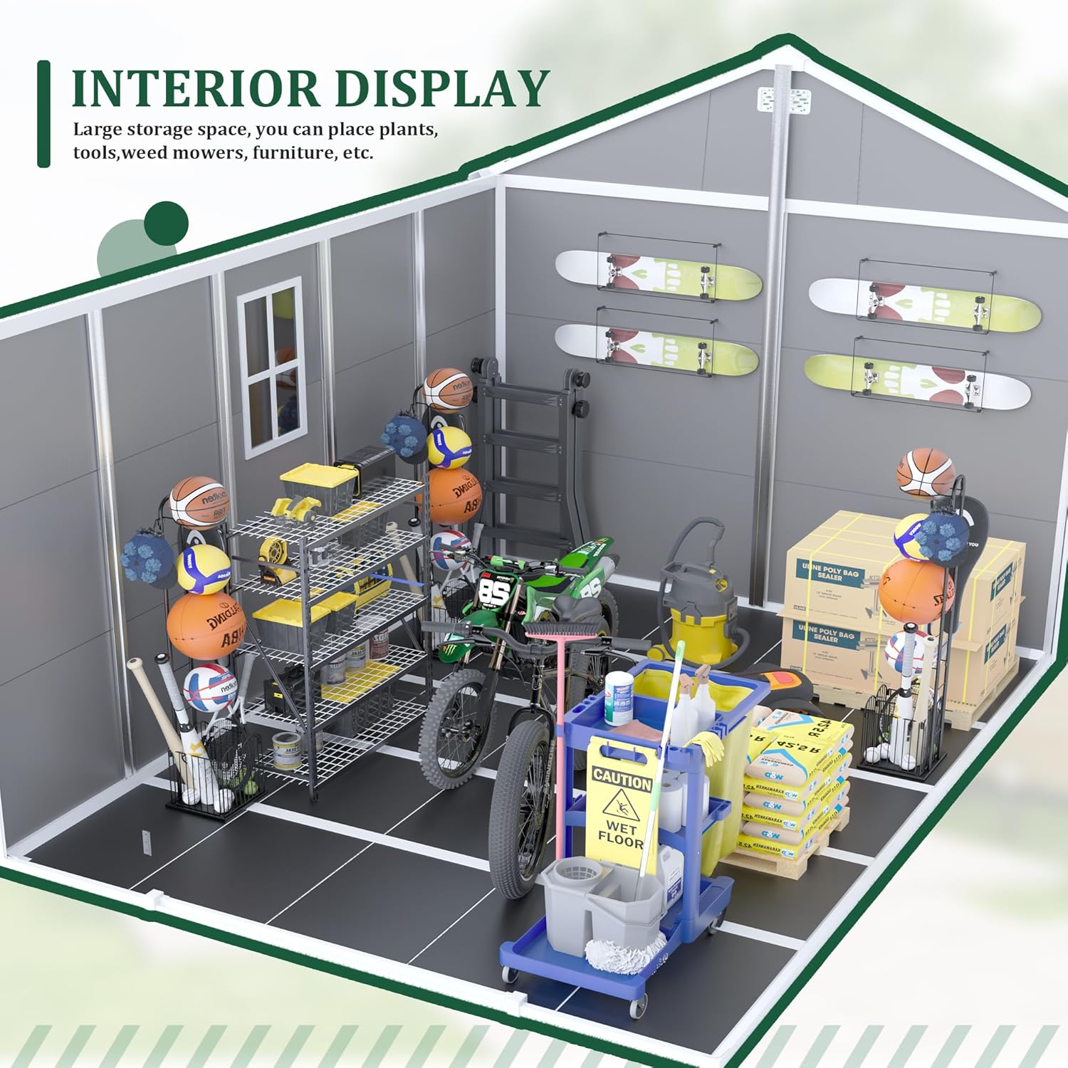 - 【10x8FT Storage Shed】The large storage space is a highlight of this plastic room. Sufficient internal volume, can easily accommodate all kinds of furniture, equipment, materials, to meet your diverse storage needs. Whether as an outdoor studio, storing tools and materials; Or as a leisure holiday house, set beds, tables and chairs and other daily necessities; Or as a warehouse, store goods and debris, can be easily.