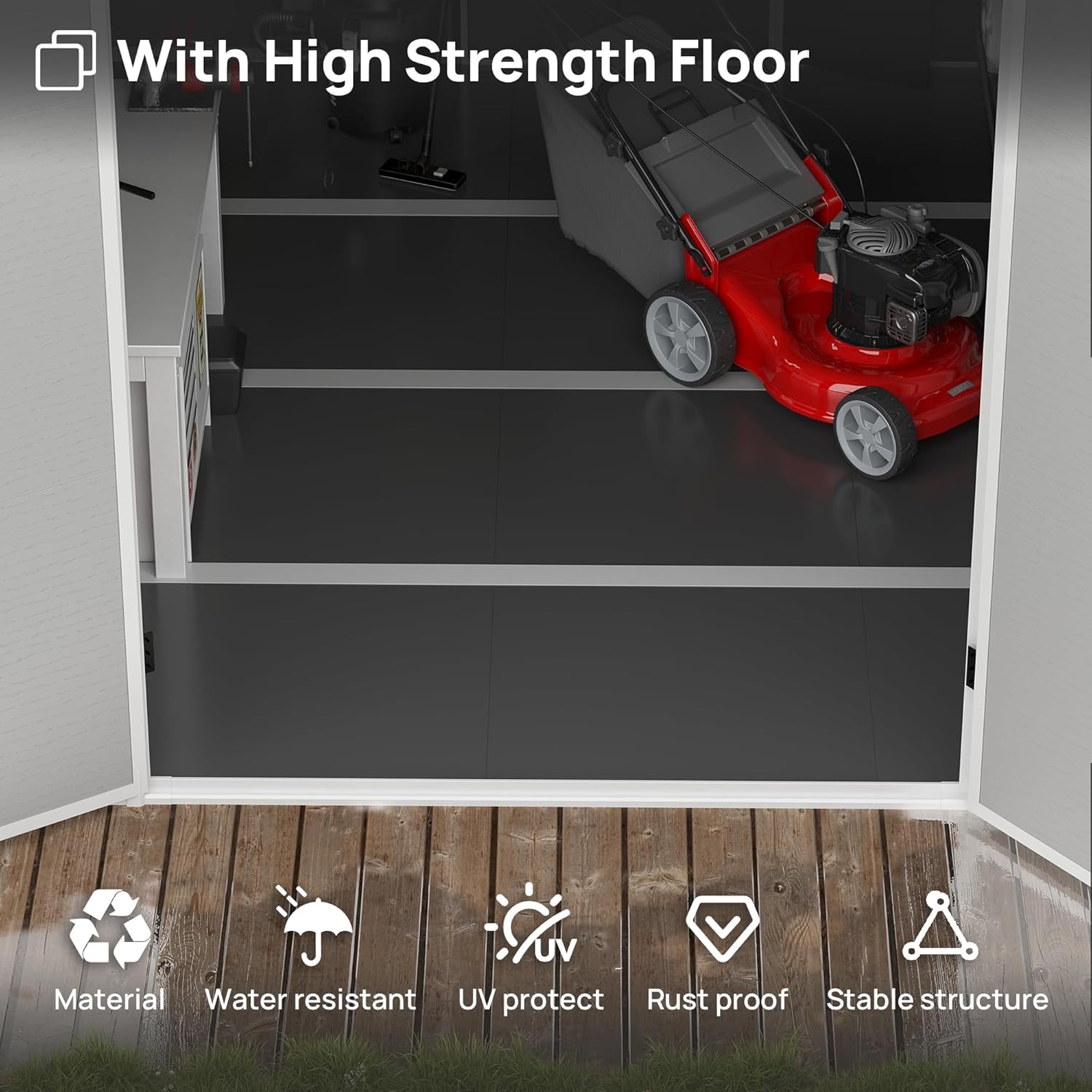 - Lockable door & with floor: Our outdoor shed has a sloped roof that adds extra storage space, prevent rainwater gathering full. Every size with the high strength floor and secure door, ensure the safety of your belongings and prevent accidental entry of small animals.